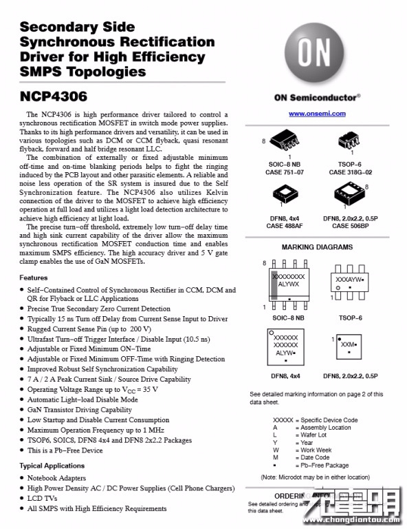 次級同步整流控制器,安森美NCP4306,支持最高1MHz開關(guān)頻率,適用于DCM或CCM反激,準諧振反激和半橋LLC拓撲。
