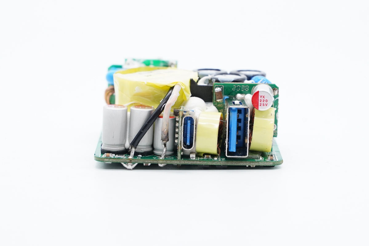 輸出端一覽,左側(cè)設(shè)有兩顆同步整流輸出濾波固態(tài)電容,USB母座旁都設(shè)有降壓電感,并且包裹絕緣膠帶。
