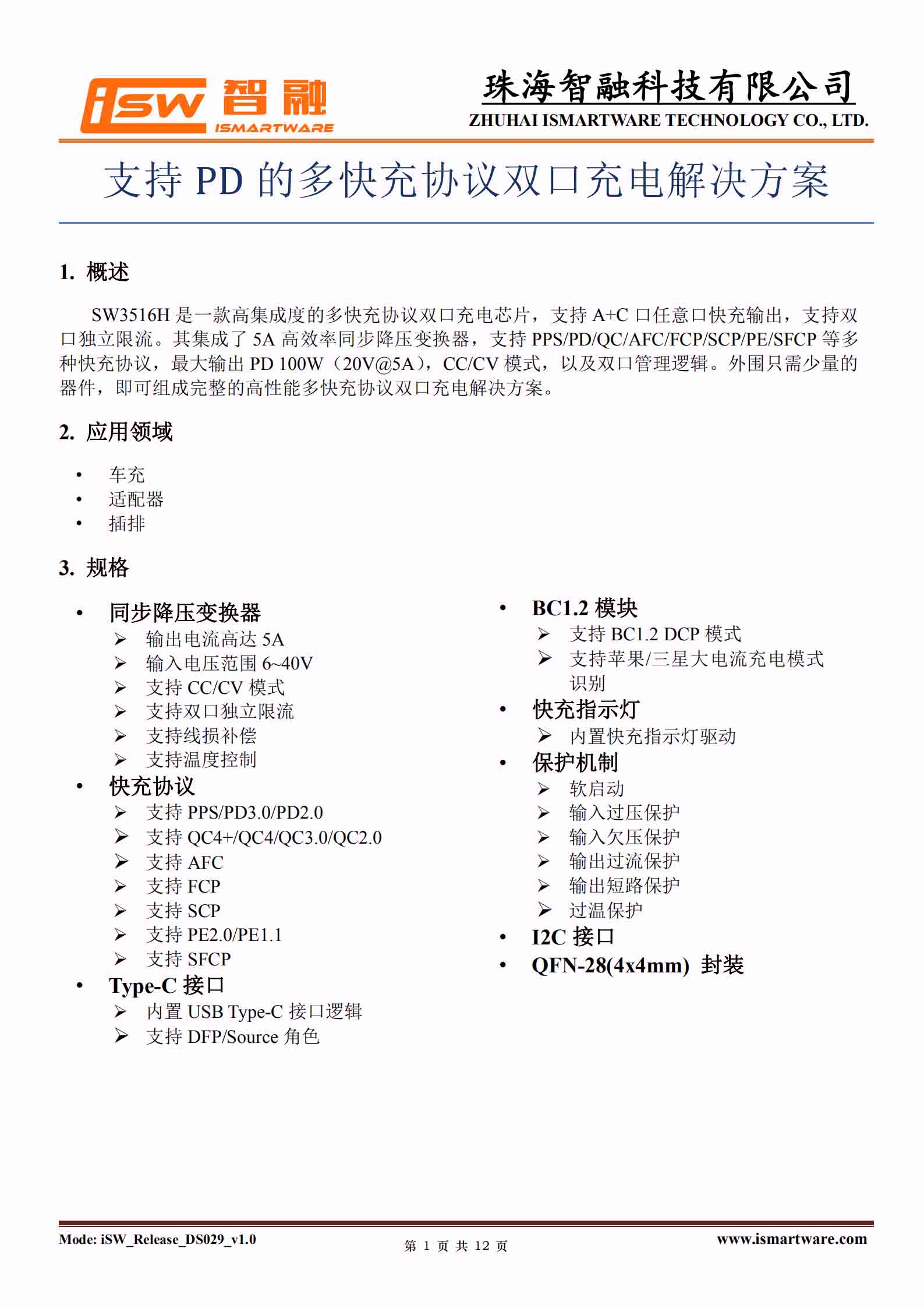 智融SW3516H是一款高集成度的多快充協(xié)議雙口充電芯片,支持A+C口任意口快充輸出,支持雙口獨立限流。其集成了5A 高效率同步降壓變換器。支持PPS/PD/QC/AFC/FCP/SCP/PE/SFCP等多種快充協(xié)議,最大輸出PD 100W,CC/CV 模式,以及雙口管理邏輯。外圍只需少量的器件,即可組成完整的高性能多快充協(xié)議雙口充電解決方案。