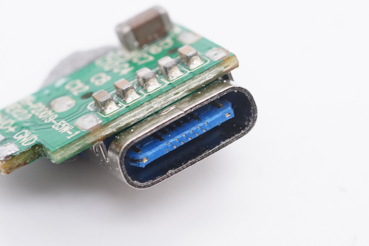 USB-C母座特寫,藍色膠芯過孔焊接。