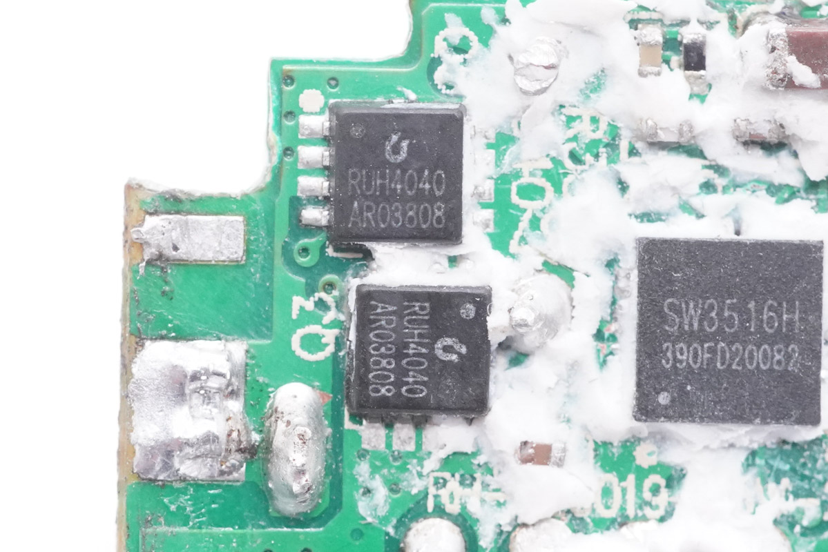 外掛兩顆銳駿RUH4040M2 MOS管為USB-C口輸出同步整流降壓,NMOS,耐壓40V。