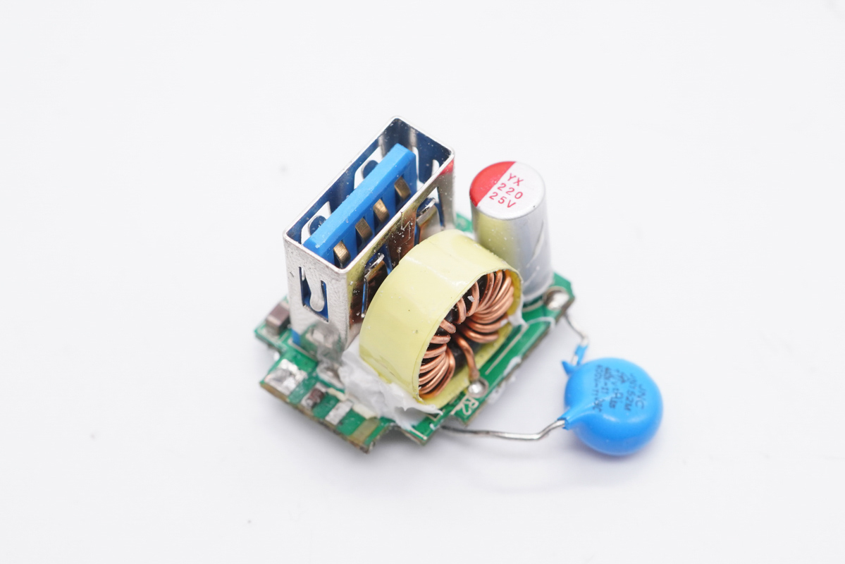 小板正面則焊接降壓電感、濾波電容以及USB-A母座。