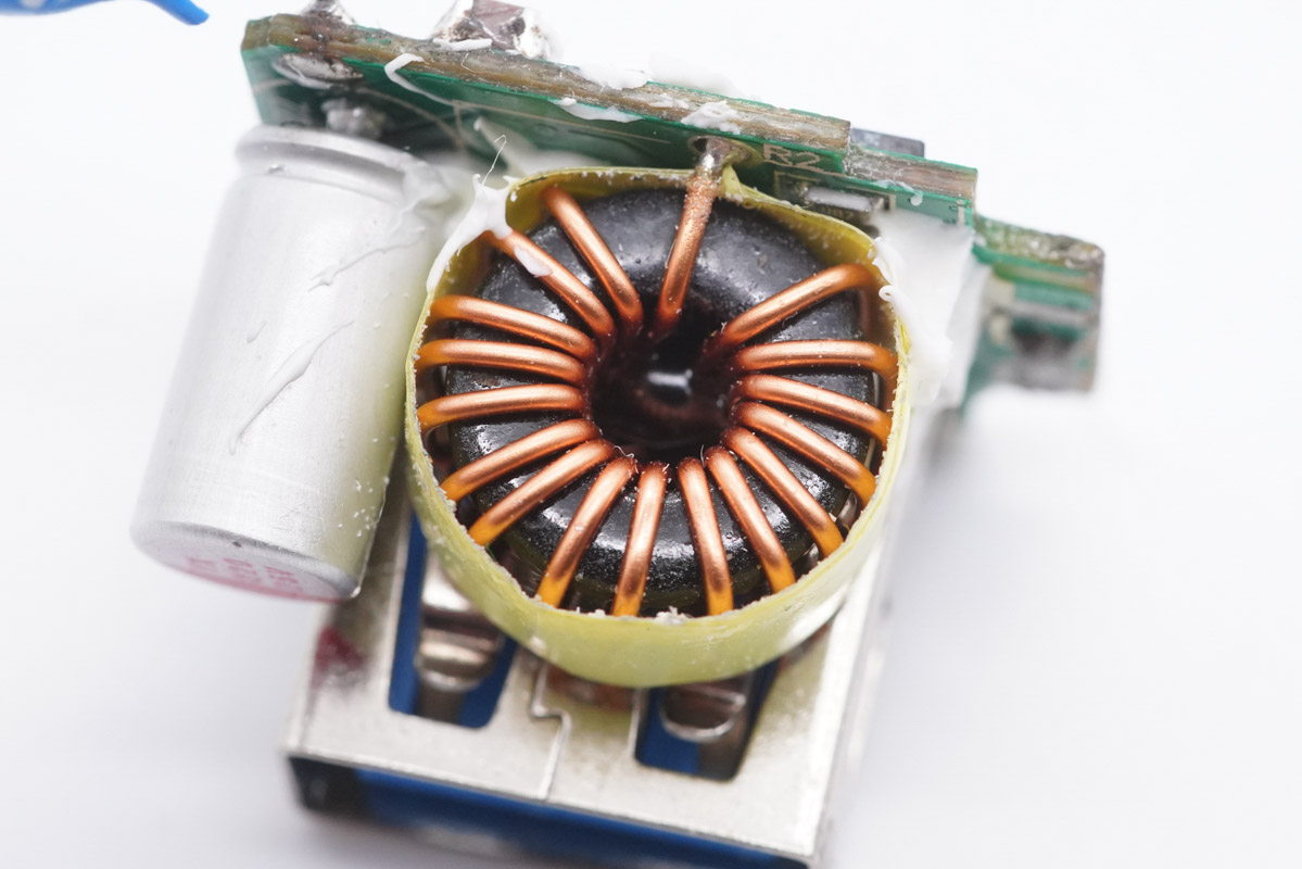 降壓電感特寫,纏繞馬拉膠帶絕緣。