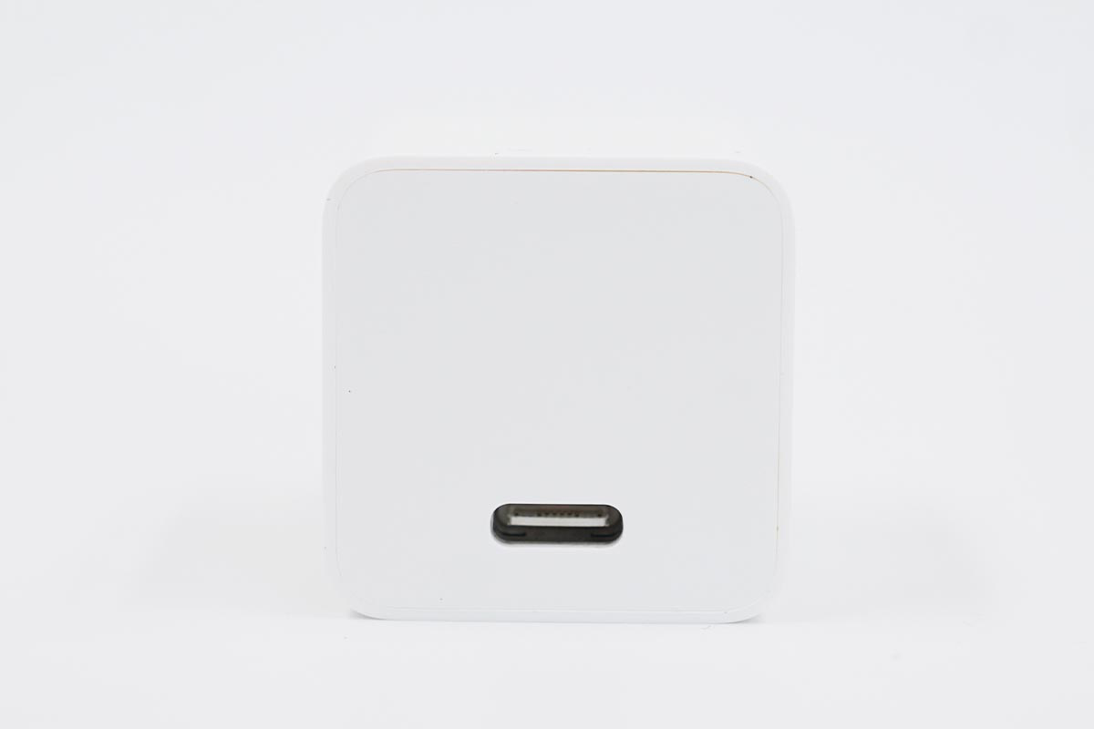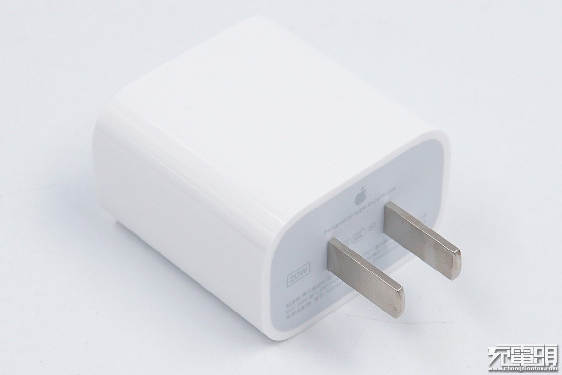 蘋果20W PD充電器延續了18W PD充電器的造型風格,整體機身較為方正,邊角處過渡圓潤,上下則做了削平的處理,且插腳不可折疊。