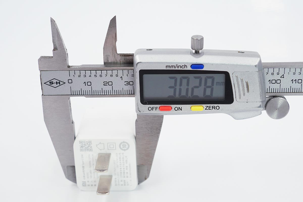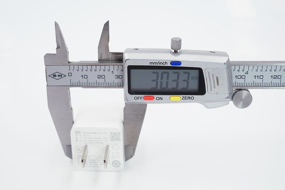使用卡尺實測充電器的長度約為30.33mm。