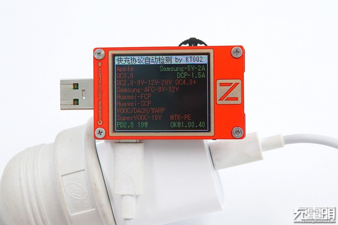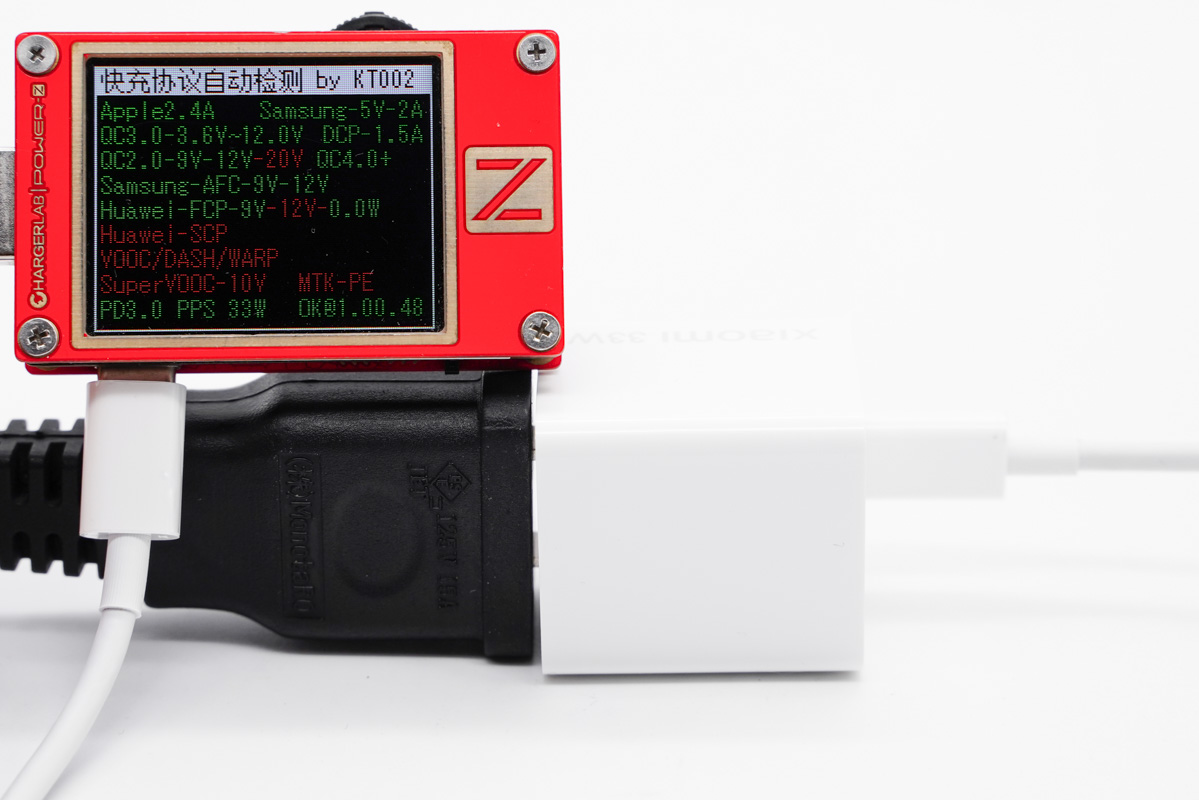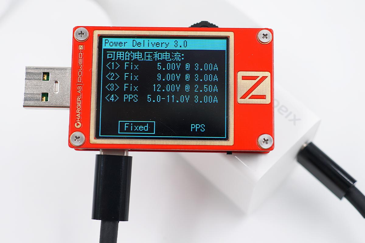 使用power-Z KT002讀取充電器的快充協議,實測支持PD、PPS、Apple2.4A、QC2.0、QC3.0、QC4+、AFC以及FCP等快充協議。