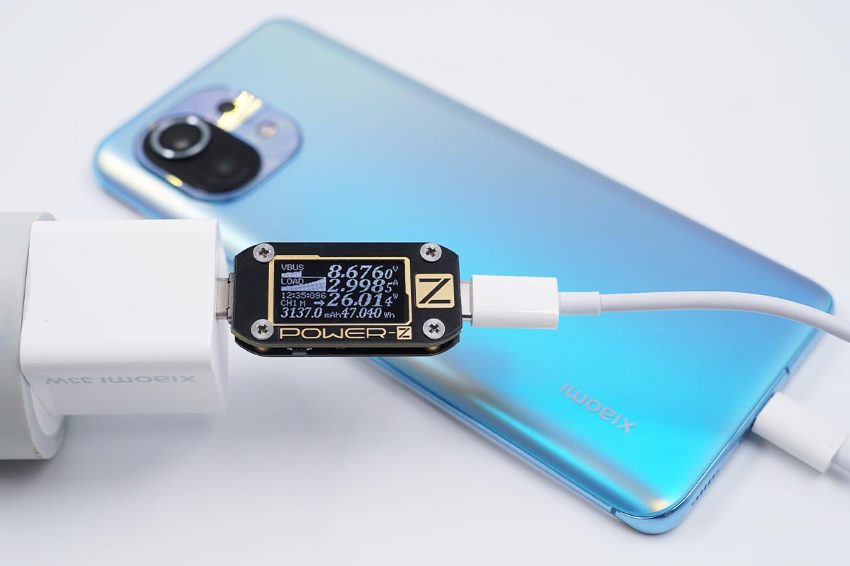 使用充電器為小米11充電,功率為8.67V 2.99A 26.01W,對小米11的快充支持情況明顯更好一些。