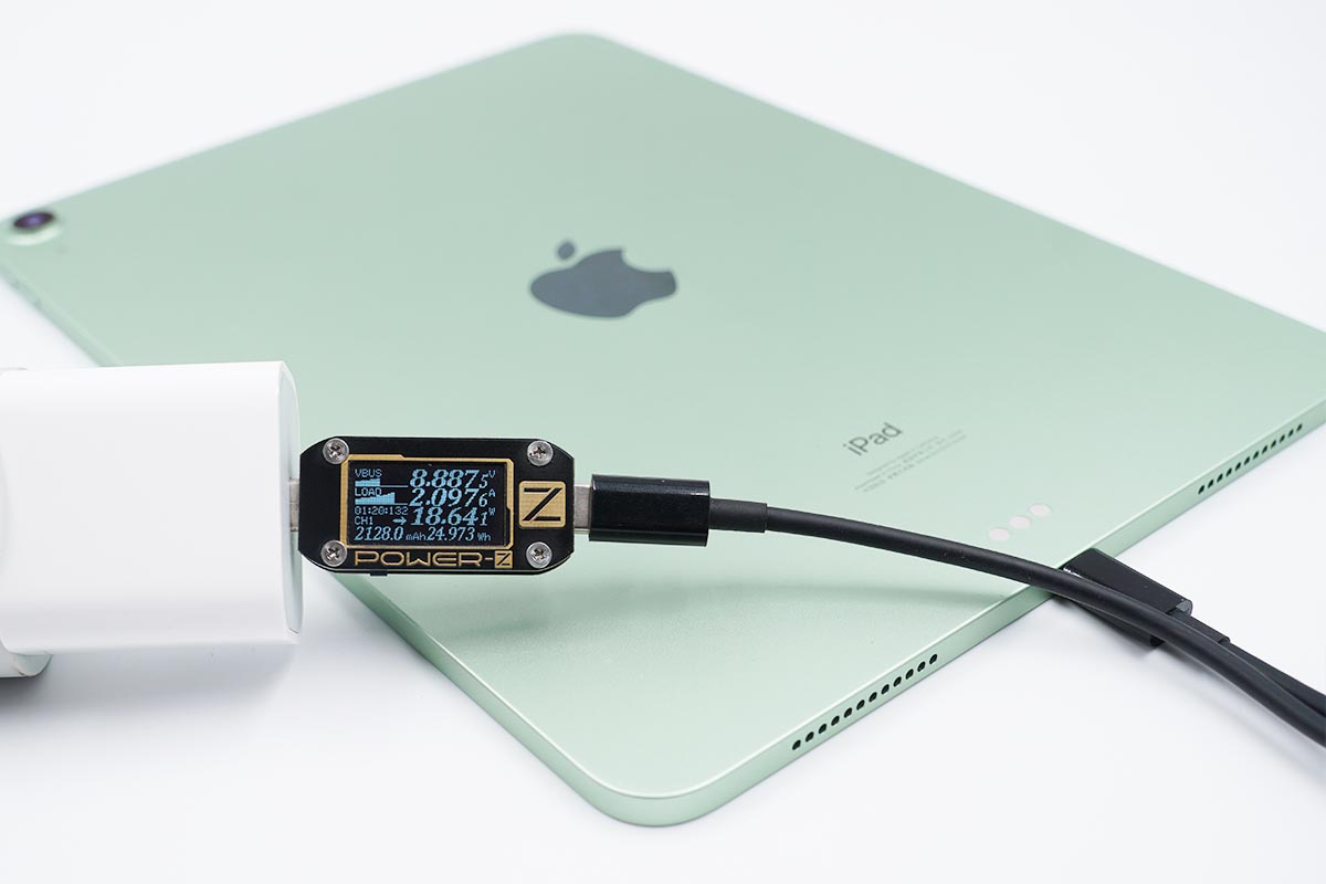 使用蘋果20W PD充電器為iPad Air 4充電,功率為8.88V 2.09A 18.64W。