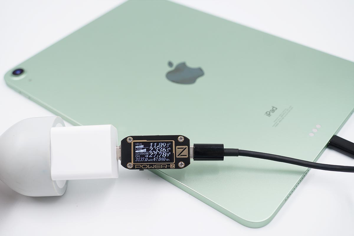 使用充電器為iPad Air 4充電,功率為11.89V 2.33A 27.78W。