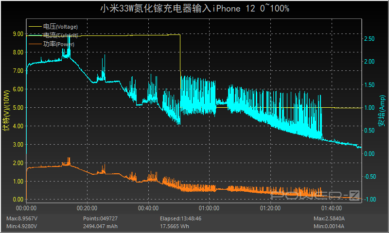 使用小米33W氮化鎵充電器為iPhone 12充電,開始時便握手PD快充,約12分前功率、電流和電壓平臺一直處于穩定的輸入狀態,功率在18W左右。隨后功率和電流開始出現階梯式的下降狀態,50分鐘后電壓從9V降至5V輸入,1小時11分后功率和電流逐漸下降直至充電結束,全程耗時約1小時48分,最高功率為8.86V 2.56A 22.69W。