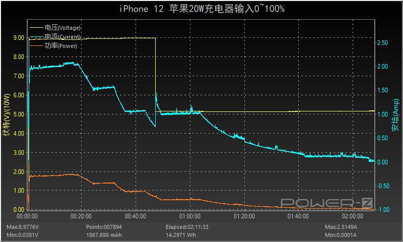 使用蘋果20W充電器為iPhone 12充電,約16分前三大數據平臺相對穩定,隨后電流和功率呈階梯式的下降狀態,48分時電壓降至5V輸入,持續了約14分后功率和電流逐漸下降直至充電結束,全程耗時約1小時41分,功率最高為8.90V 2.06A 18.41W。