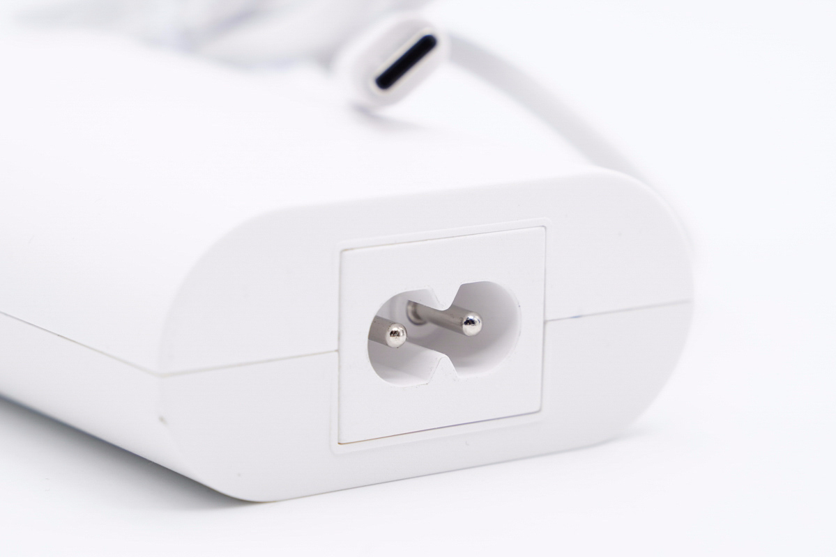 今天要拆解的這款適配器便是上述筆記本的標配電源,其采用標配筆記本適配器造型設計(輸入8字形,自帶輸出TypeC) ,輸出支持PD/PPS快充,最大輸出功率65W。和我們平時見到的不是正方形就是長方形的其它品牌氮化鎵充電器相比,為了提升安全性,實現更好的散熱效果,這款產品采用了弧線形板磚造型設計。人性化的設計,握在手中,毫無壓力。下面我們就對這款產品進行詳細拆解,看看產品內部具體是怎么設計的。