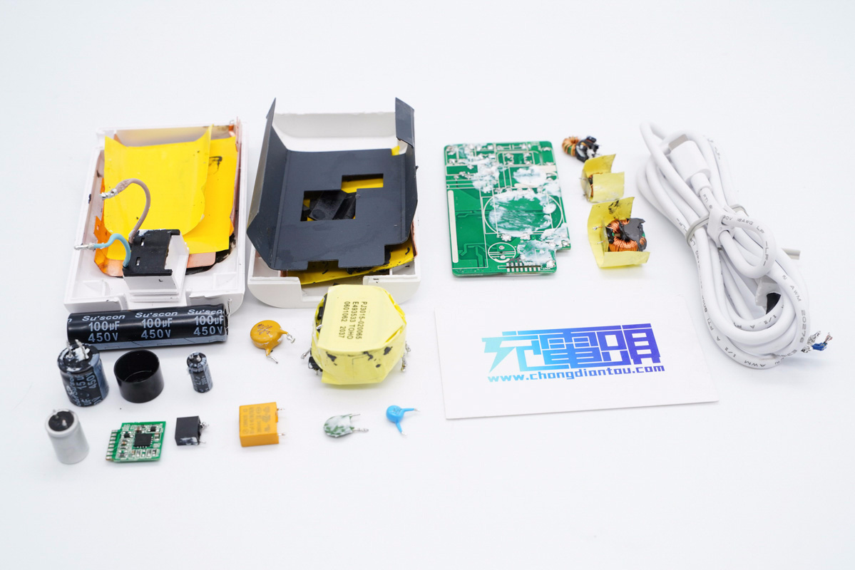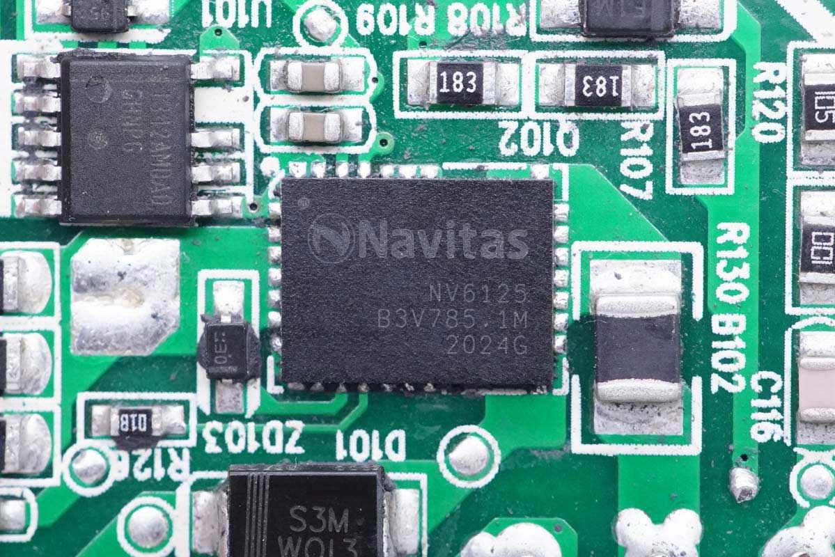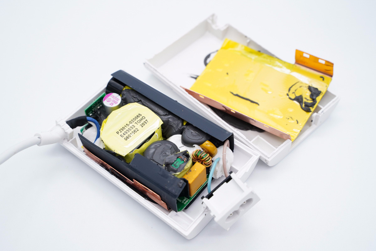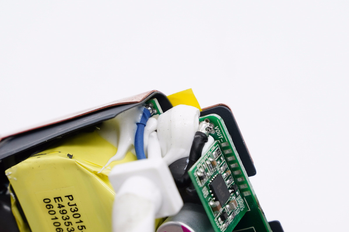 充電頭網通過拆解了解到,充電器開關電源由安森美NCP1342搭配納微NV6125氮化鎵功率開關管,以及MPS MP6908A搭配萬代同步整流管組成,輸出協議芯片采用偉詮WT6636F認證芯片,并且外接熱敏電阻進行過熱保護。另外充電器采用大容量電容進行輸入輸出濾波,且均來自臺系冠坤,內部大面積填充導熱膠,整體用料扎實可靠。