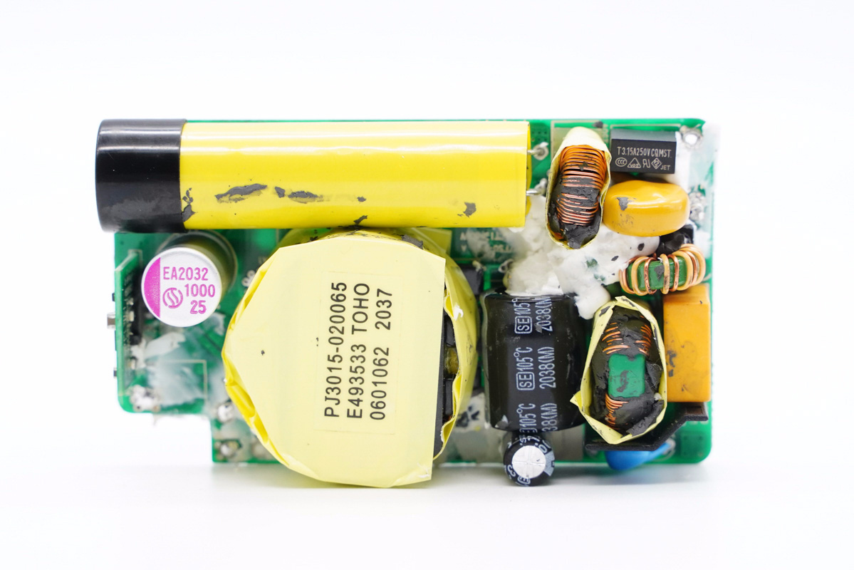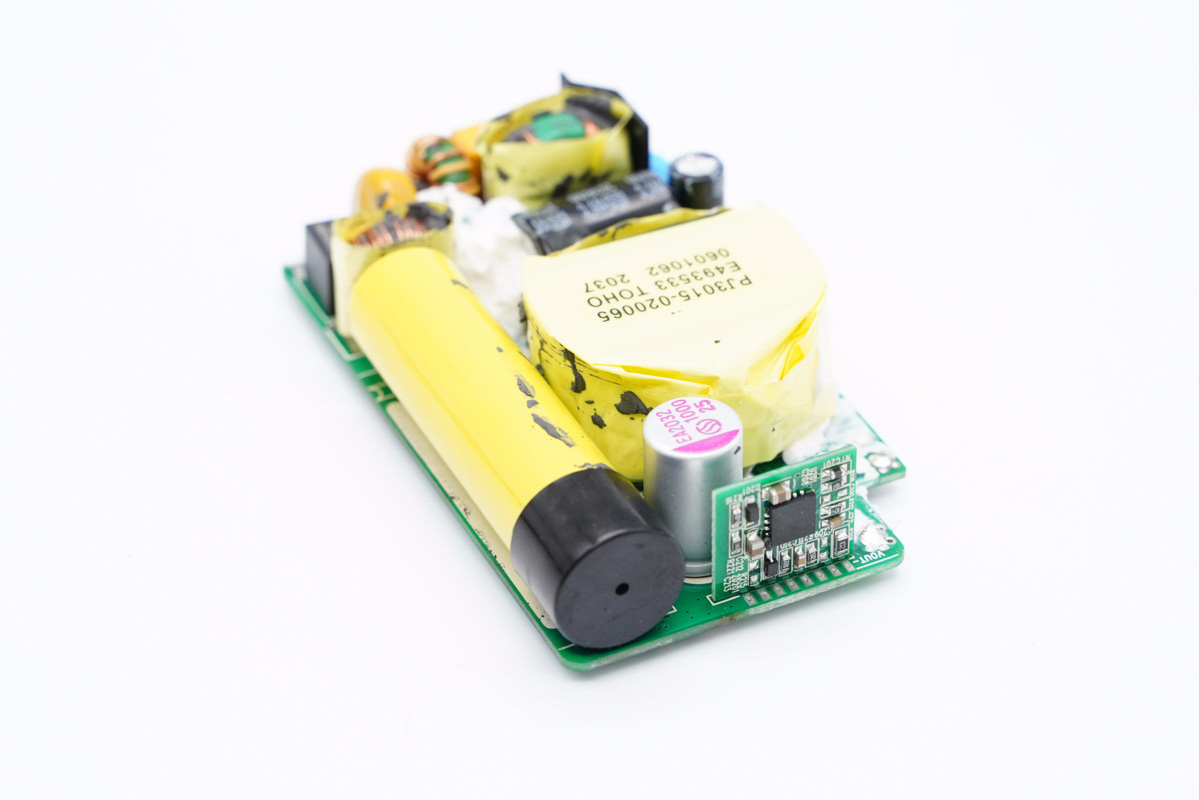 PCB板側面還橫置一顆大體積電解電容,頭部套上黑色絕緣管,其余部位使用絕緣膠帶包裹加強絕緣。