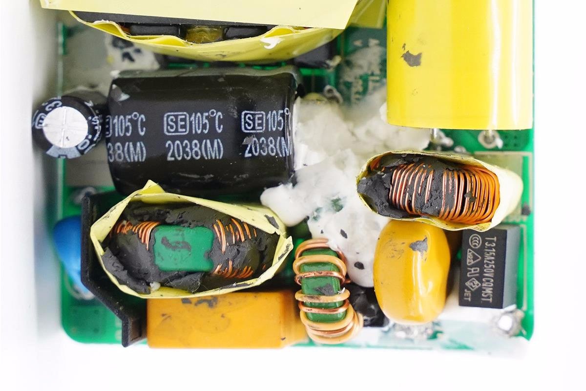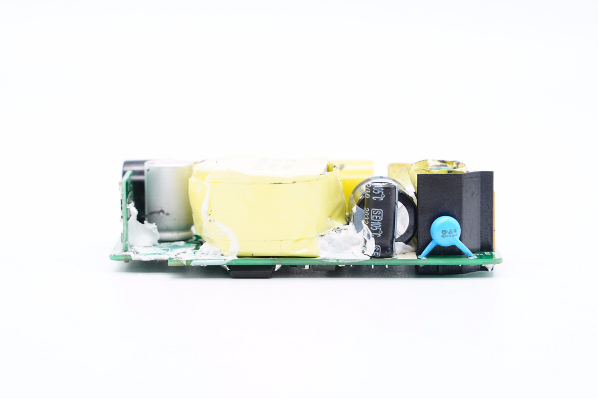 充電器輸入端一覽,濾波電感和共模電感包裹絕緣膠帶。