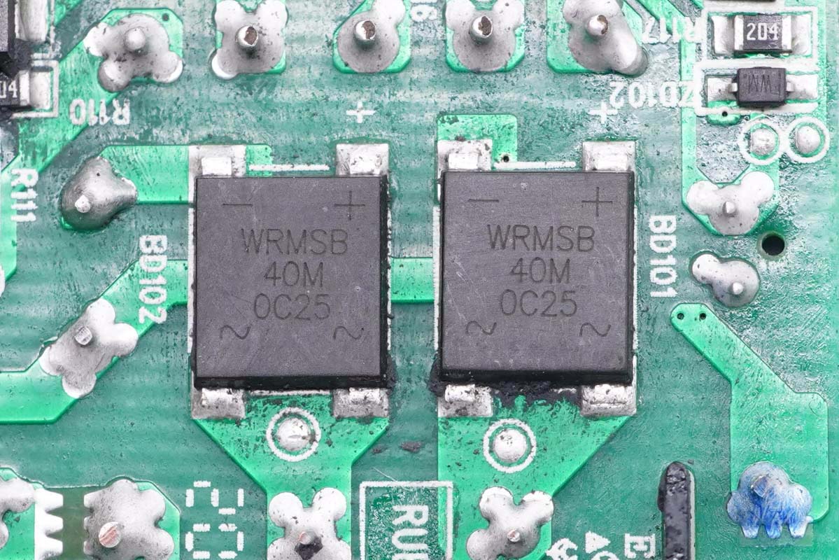 輸入端兩顆WRMSB40M整流橋,用于均攤發熱,降低溫升。WRMSB40M來自深圳市沃爾德實業有限公司,這顆軟橋通過較軟的恢復曲線,比較平滑的關斷特性,可以降低二極管結電容達到非常少的諧波振蕩產生的效果。