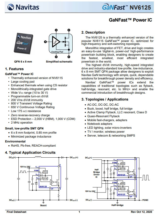 初級側氮化鎵功率芯片采用納微NV6125,內置驅動器,無需外置驅動器,175mΩ導阻,耐壓650V,支持2MHz開關頻率,采用散熱增強的QFN6*8mm封裝,適用于升壓,降壓,半橋,全橋開關電源等諸多應用場合。