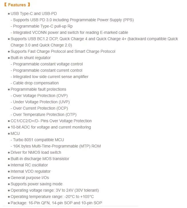 WT6636F支持USB PD3.0和PPS,內置可編程的恒壓恒流控制,集成低側電流采樣放大器,支持線損補償,支持多重保護功能,包括數據線的過壓保護,內部集成10bit ADC用于電壓和電流檢測,內置8051內核單片機,內置放電MOS管。