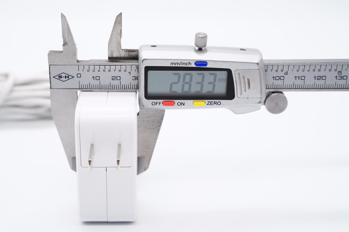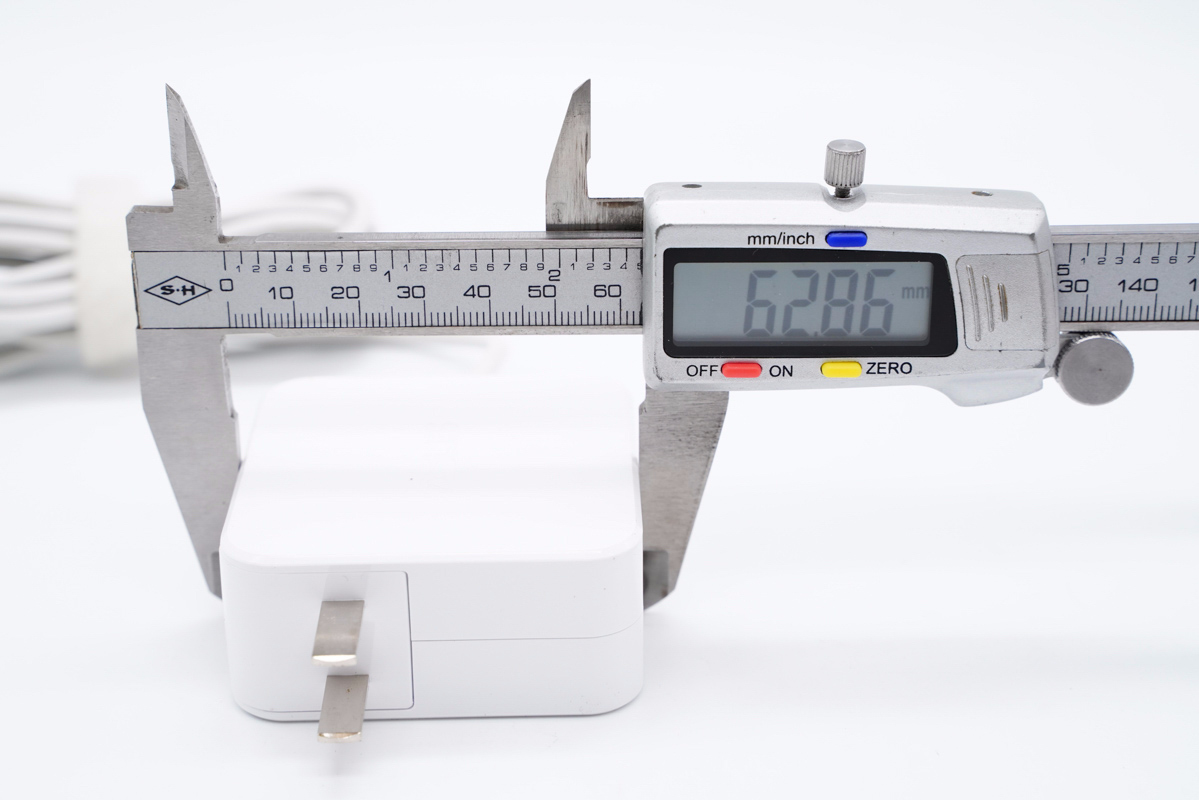 使用游標卡尺實測充電器機身長度為62.96mm。