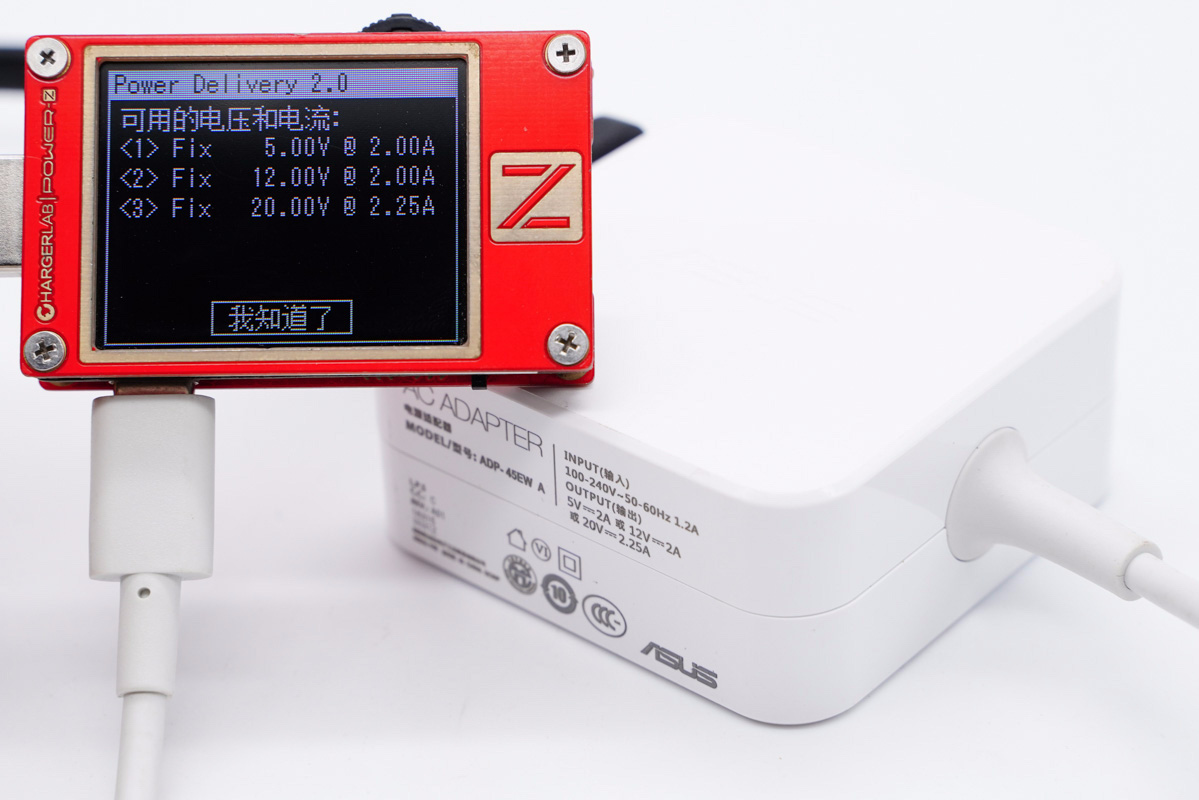 使用ChargerLAB POWER-Z KT002測得充電器僅支持PD2.0快充協議。