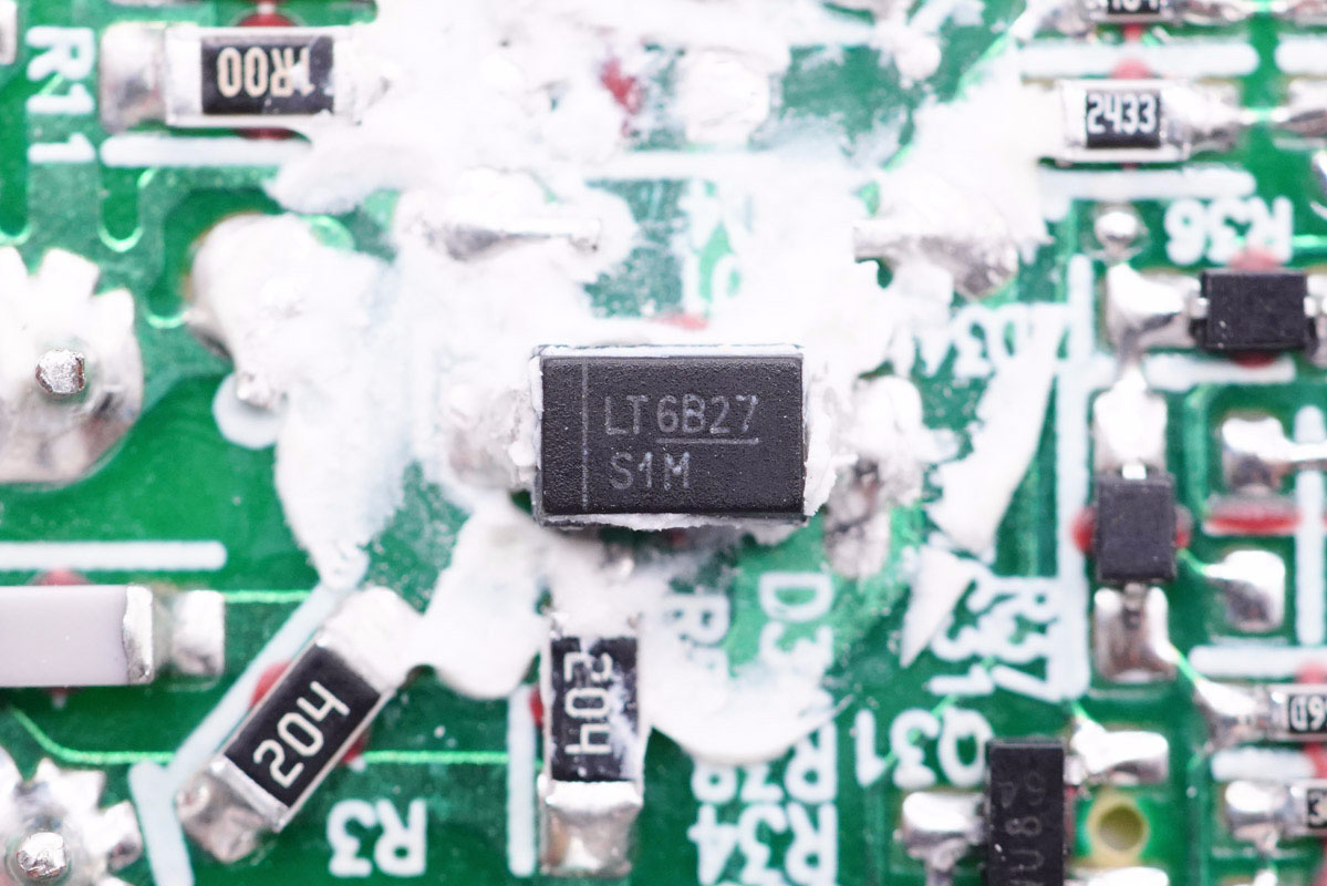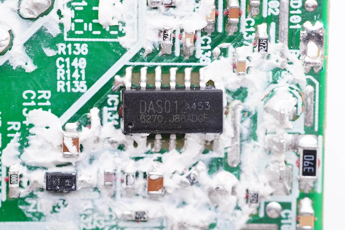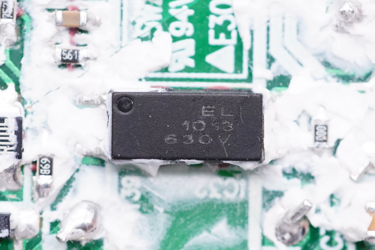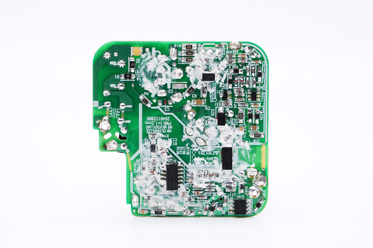 將硅膠清理干凈,PCB板空間相對富足,元器件分布稀疏,不易積熱,圖片左側有臺達LOGO,使用單層板波峰焊接。