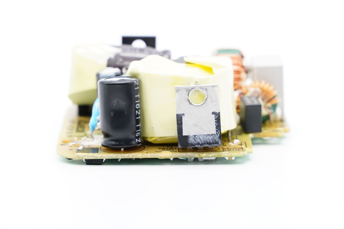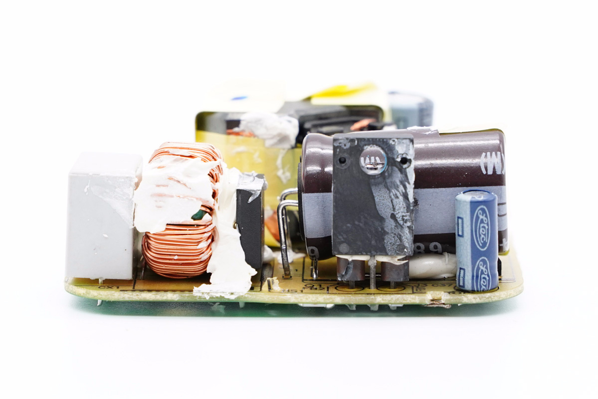 PCB板側面一覽,這一側設有整流橋、高壓濾波電解電容、主控芯片供電電容以及初級開關MOS管。