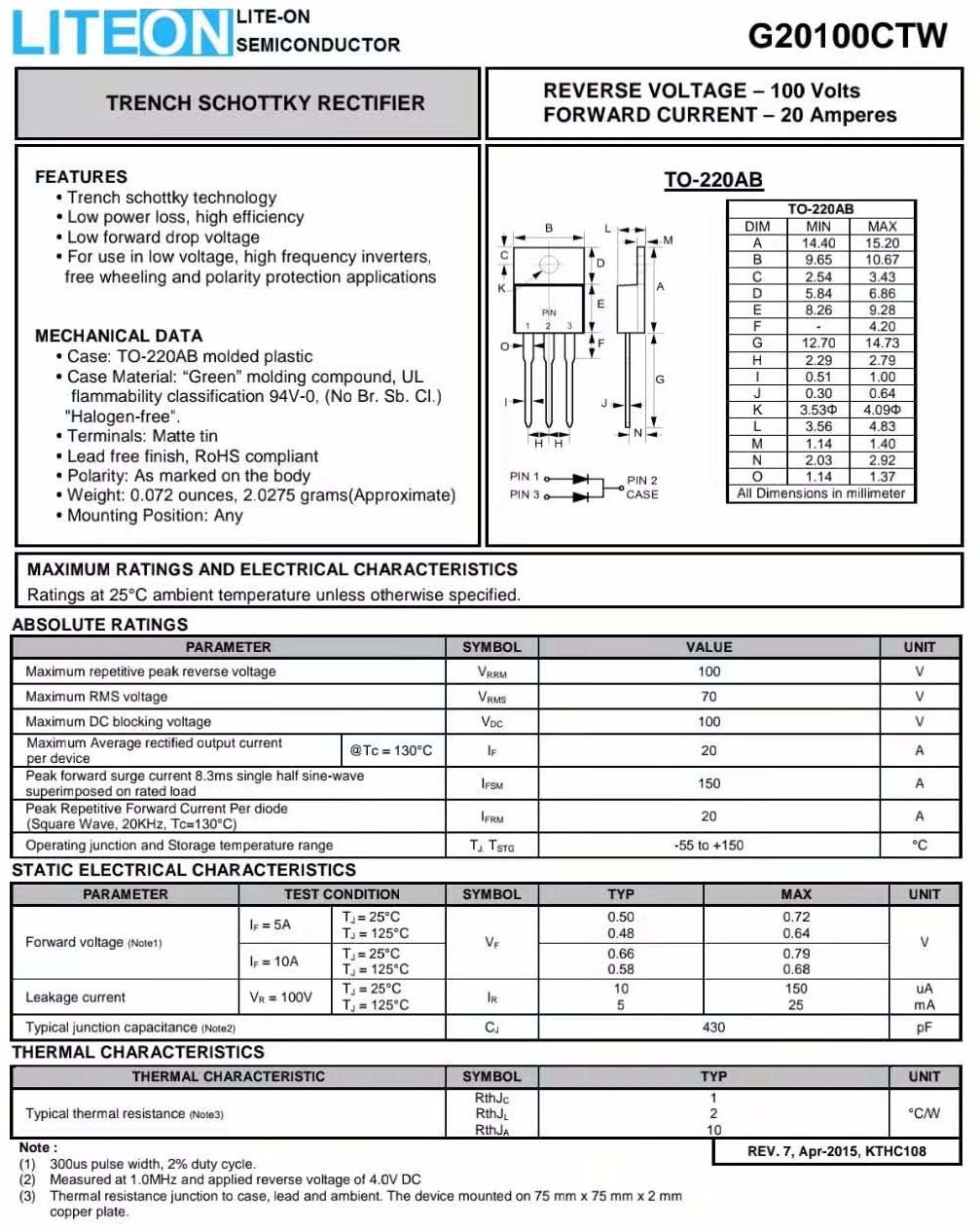 肖特基整流管采用敦南G20100CTW,耐壓100V。