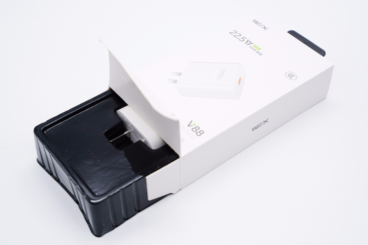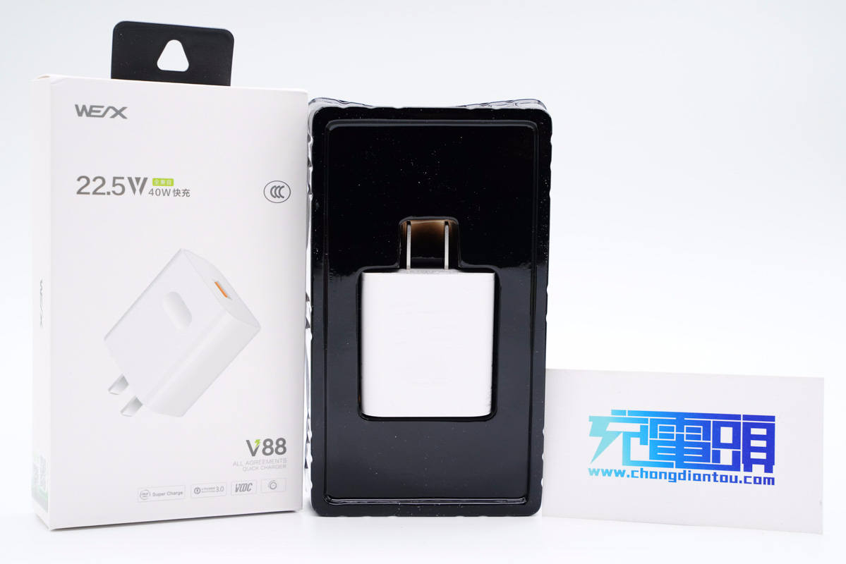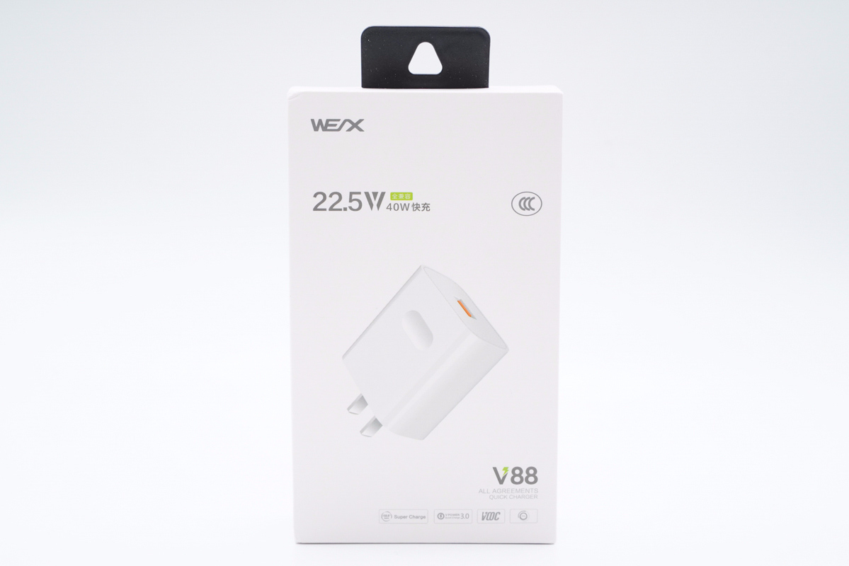 包裝盒正面印有WEX品牌、充電器外觀圖,以及22.5W/兼容40W快充、CCC認證、V88型號等標識。