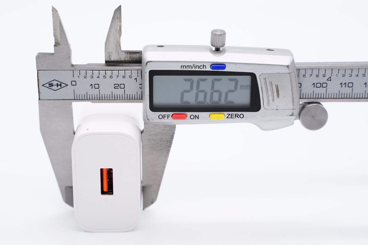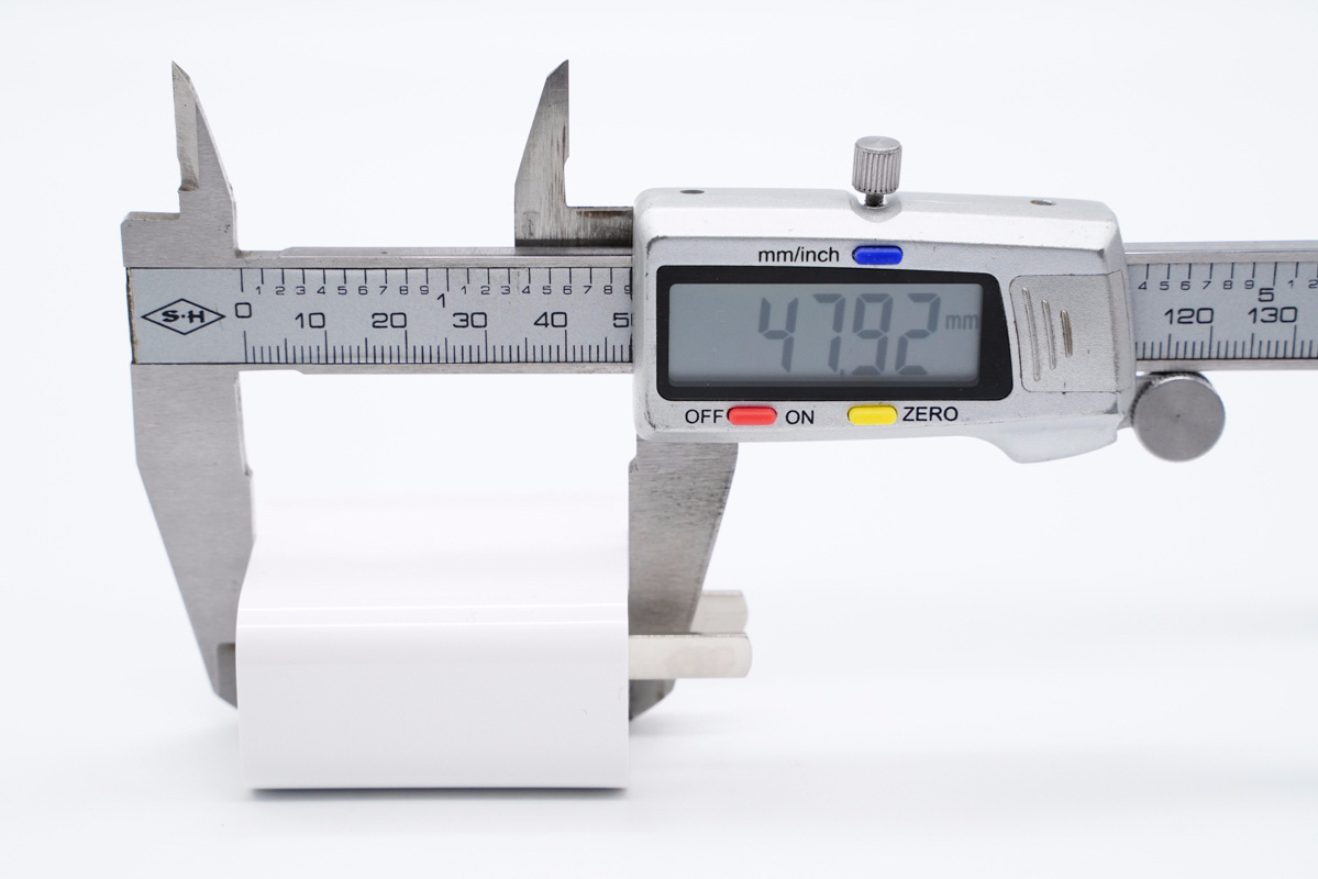 使用游標卡尺實測充電器機身長度為47.92mm。