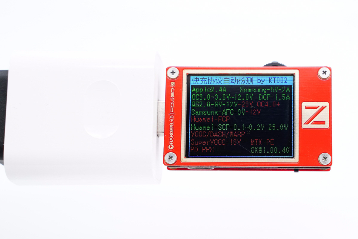 使用ChargerLAB POWER-Z KT002讀取USB-A接口輸出協議,顯示支持Apple 2.4A、Samsung 5V2A、DCP協議,以及QC2.0/3.0、AFC、SCP快充協議。