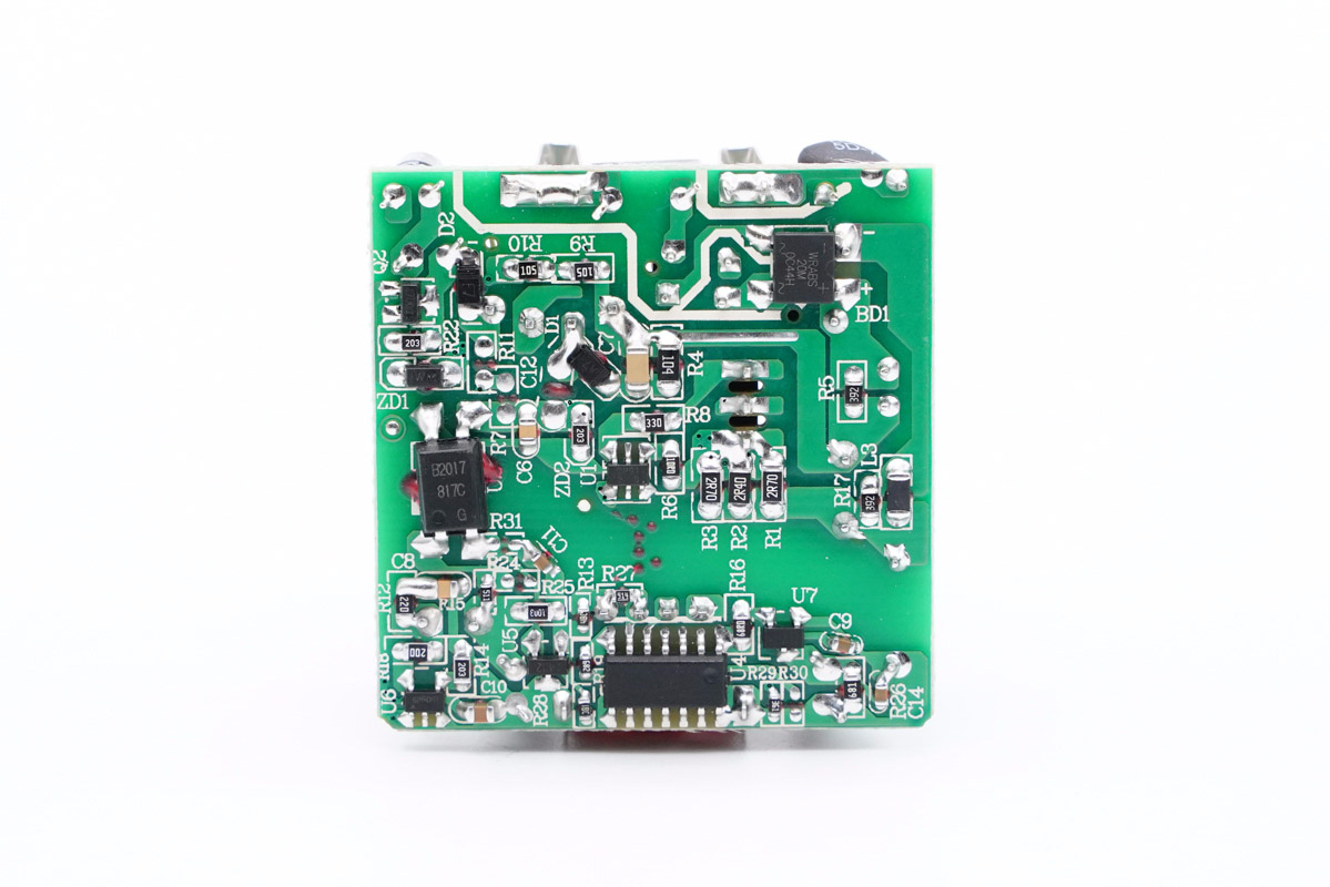通過觀察發現,這款充電器采用典型的開關電源寬范圍輸出,由次級協議芯片通過光耦反饋控制輸出電壓的設計架構。下面來詳細了解各元器件的信息。
