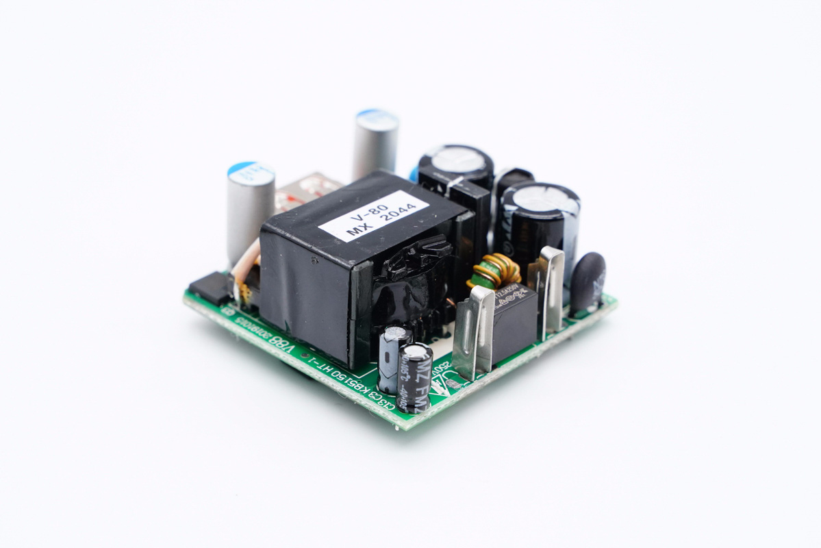 從另一對角看去,還有兩顆高壓濾波電解電容、工字電感、Y電容、輸出濾波固態電容等。