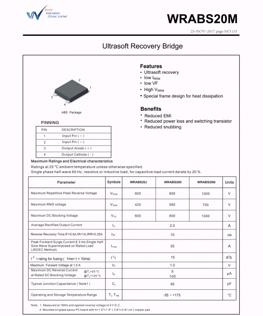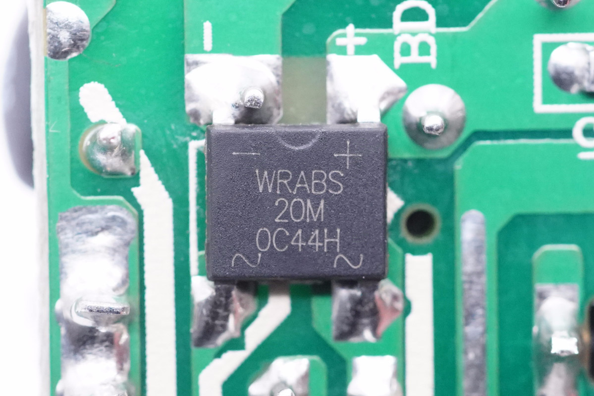 整流橋采用深圳市沃爾德實業有限公司的WRABS20M。這顆軟橋通過較軟的恢復曲線,比較平滑的關斷特性,可以降低二極管結電容達到非常少的諧波振蕩產生的效果。