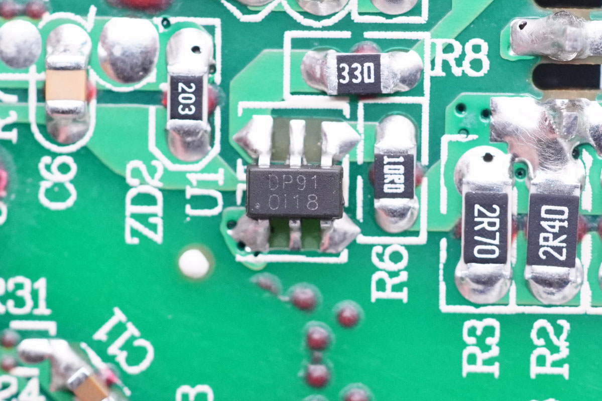 充電頭網通過拆解發現,充電器開關電源部分采用德普微DP2291和芯茂微LP35116P初次級控制器分別搭配芯派科技高壓MOS管和同步整流管組成,由協議芯片控制輸出電壓。電路板上元器件分布稀疏,不易積熱,充電過程保持一個較低的發熱水準,充電更穩定。