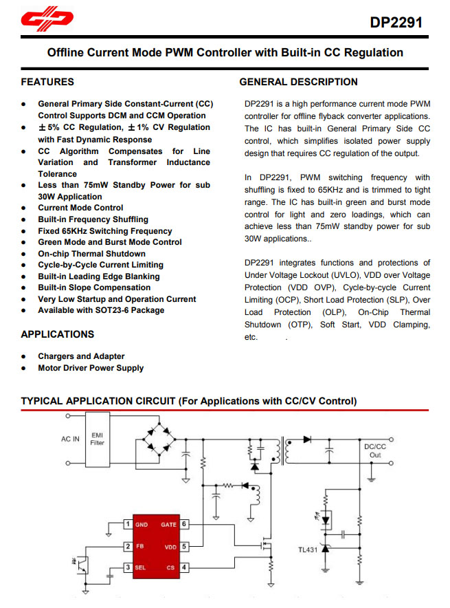 PWM主控芯片采用德普微DP2291,德普微DP2291是一顆用于離線反激開關電源的高性能電流模式PWM控制器。內置初級側恒流控制,簡化隔離開關電源的輸出恒流設計。DP2291采用固定的65KHz工作頻率,芯片內置綠色模式和突發模式用于空載和輕載,待機功耗低于75mW。DP2291集成多種保護功能,且具有超低的啟動和工作電流。