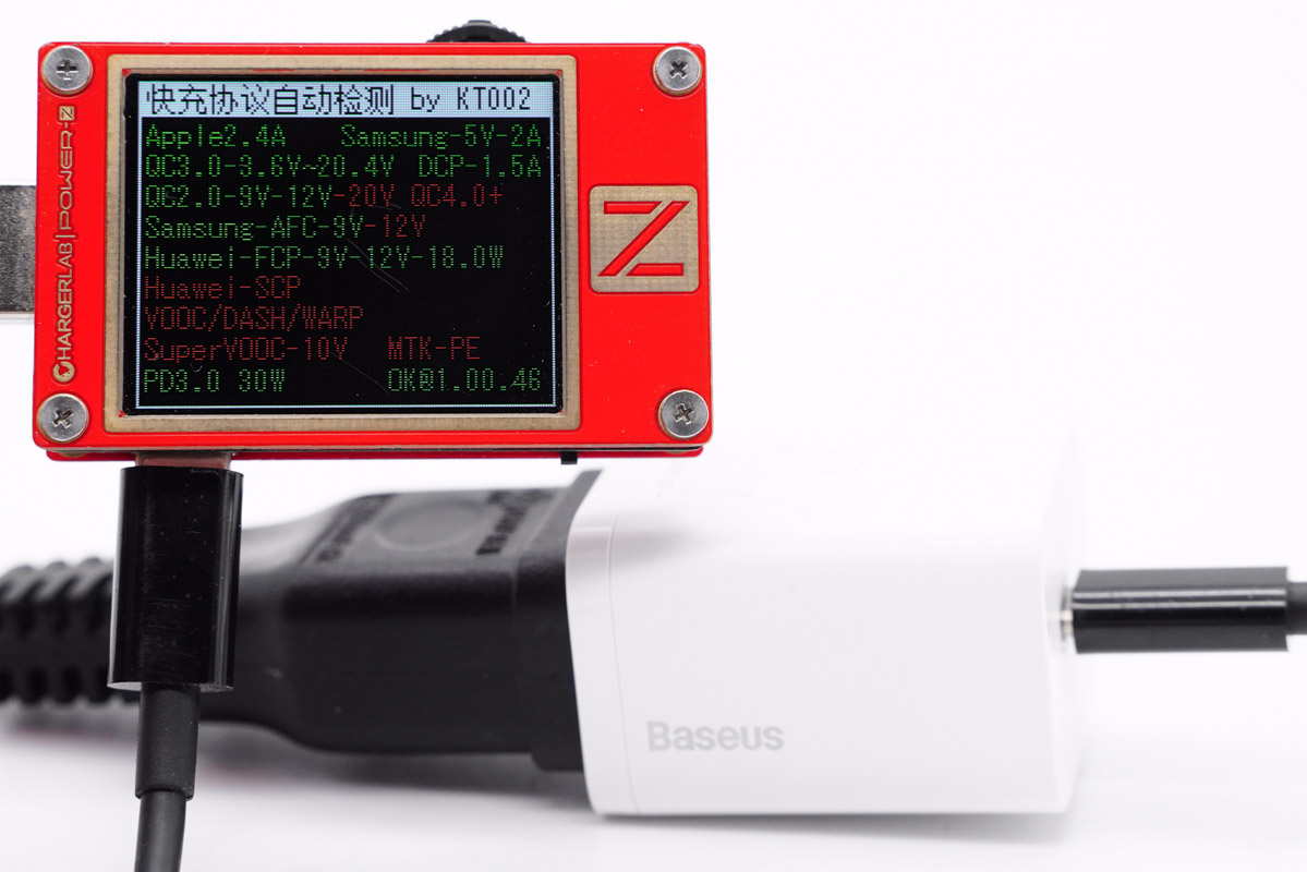 使用ChargerLAB POWER-Z KT002檢測USB-C口輸出協(xié)議,顯示支持Apple 2.4A、Samsung 5V2A和DCP協(xié)議,以及QC2.0/3.0、AFC、FCP、PD3.0快充協(xié)議。