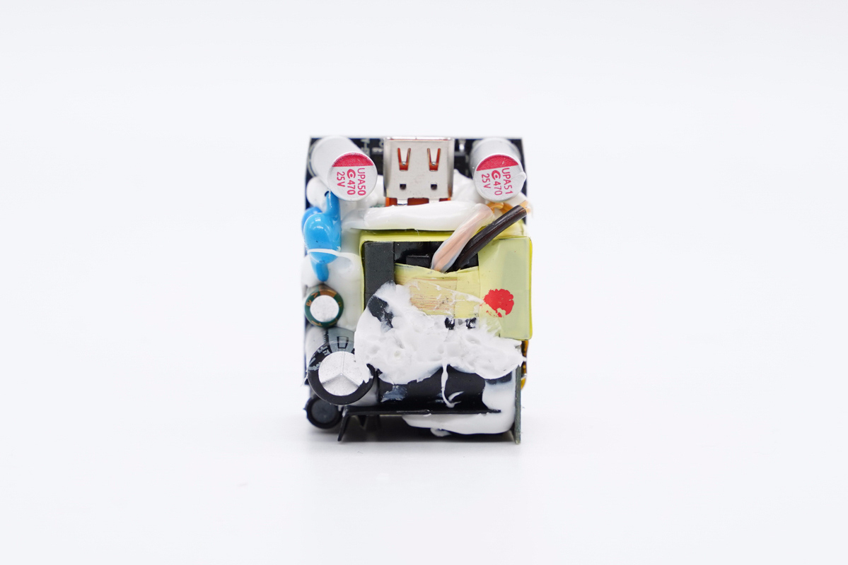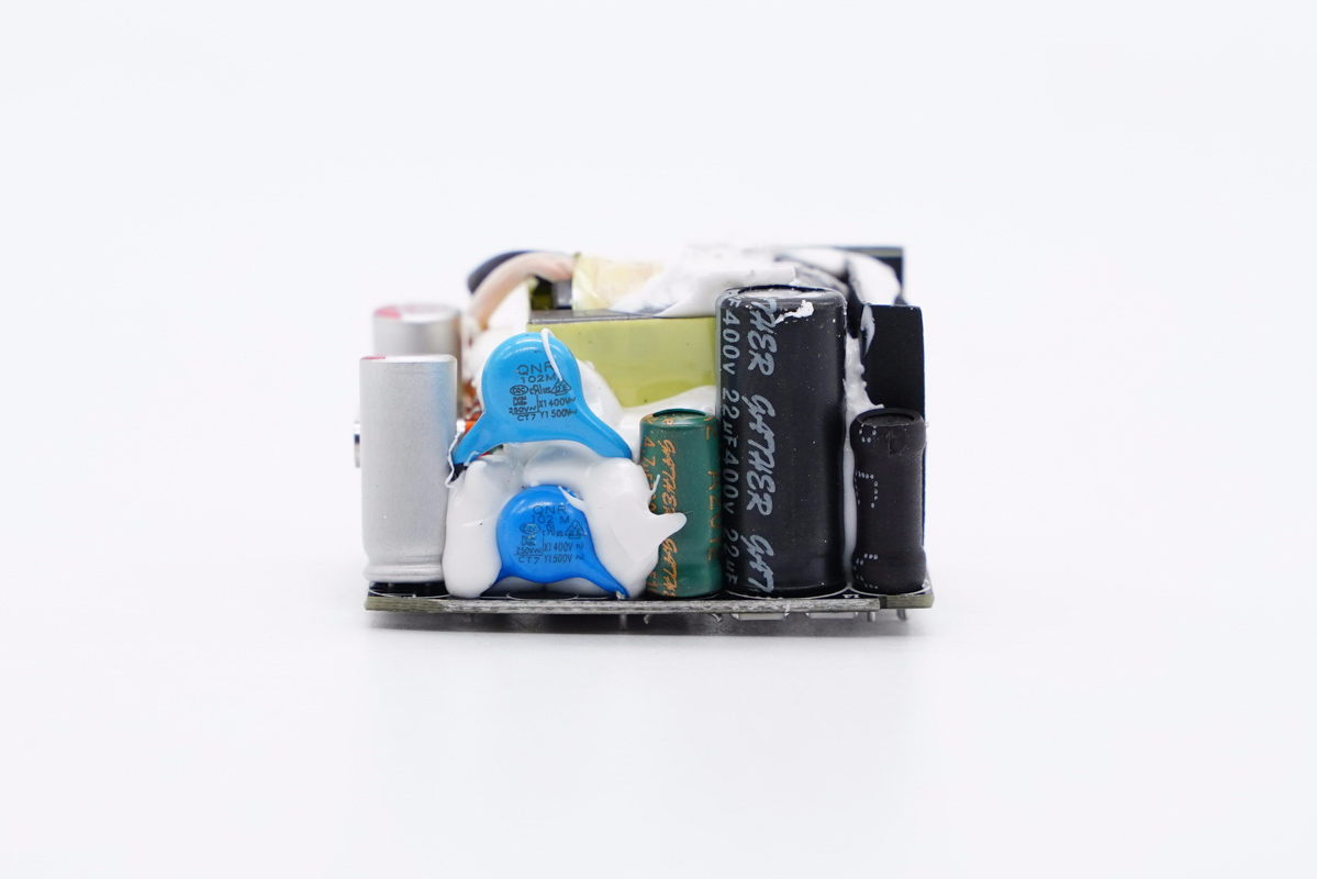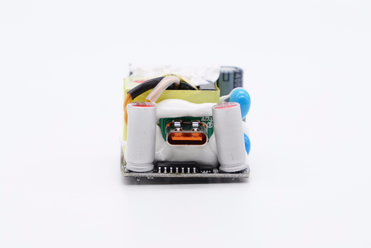 輸出端一覽,USB-C母座焊接在小板上,兩側(cè)設(shè)有濾波電容,下方設(shè)有次級芯片和VBUS開關(guān)管。