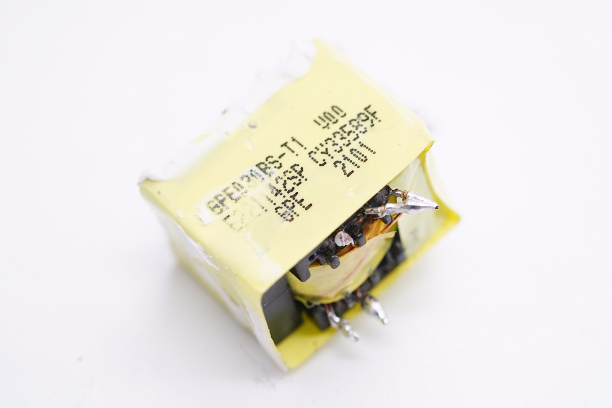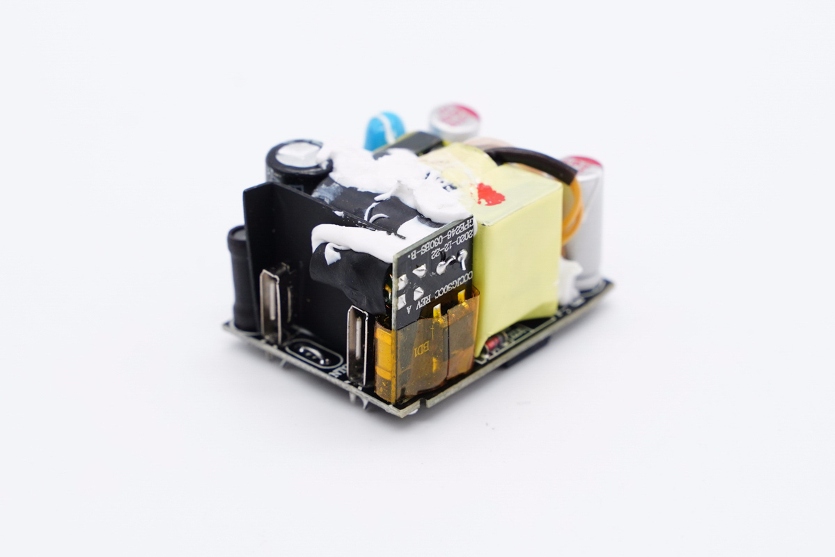PCB板正面,可以看到?jīng)]有做復(fù)雜的疊板設(shè)計,主要由一塊大的主PCB加輸入端一個小PCB組成,變壓器及其周圍元器件全部打膠處理,增強整體機械強度。