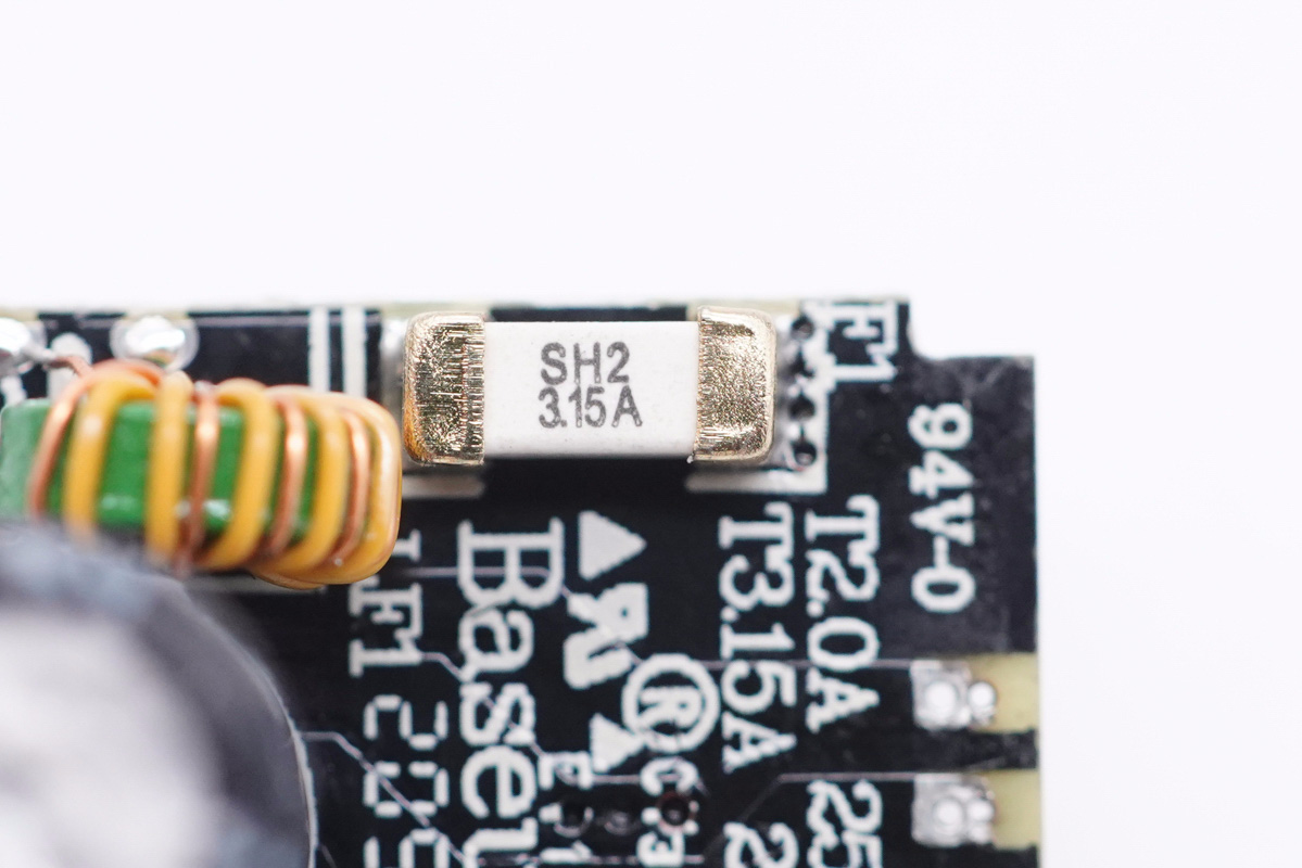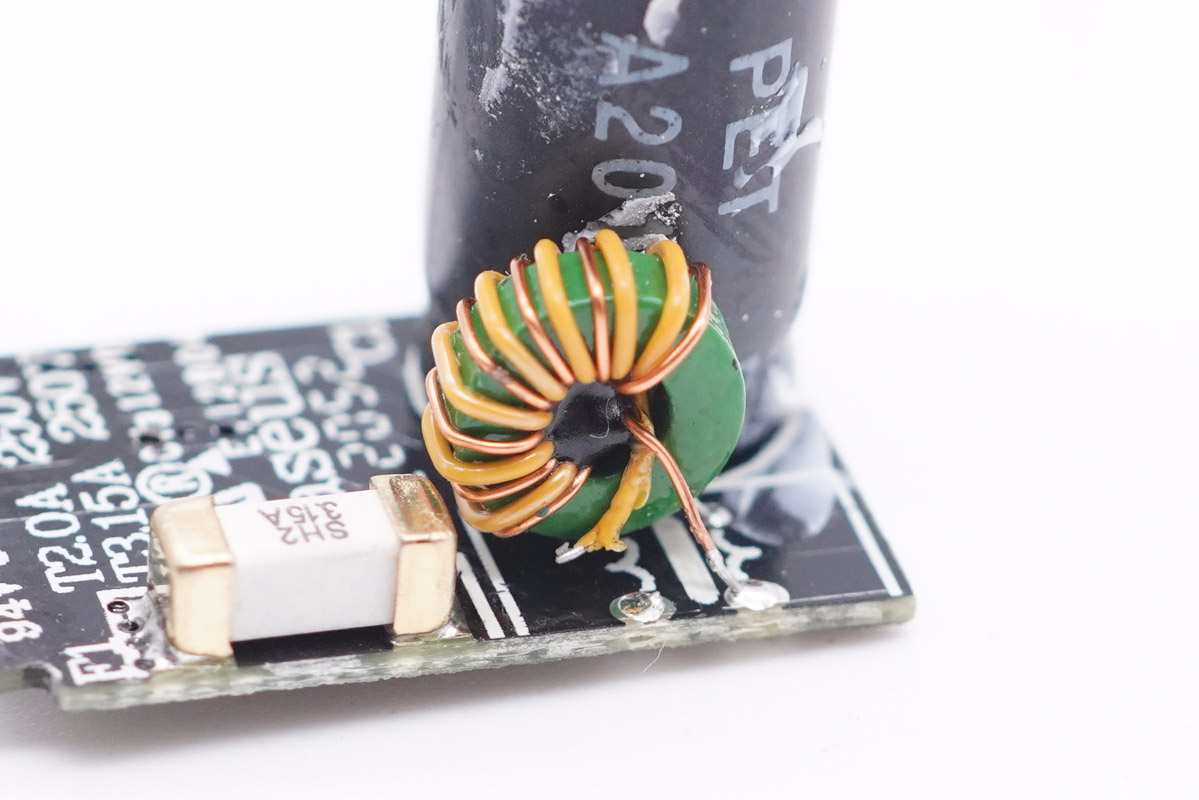 將小板拆下,正面設(shè)有保險絲、共模電感和高壓濾波電解電容,小板部分區(qū)域包裹絕緣膠帶。