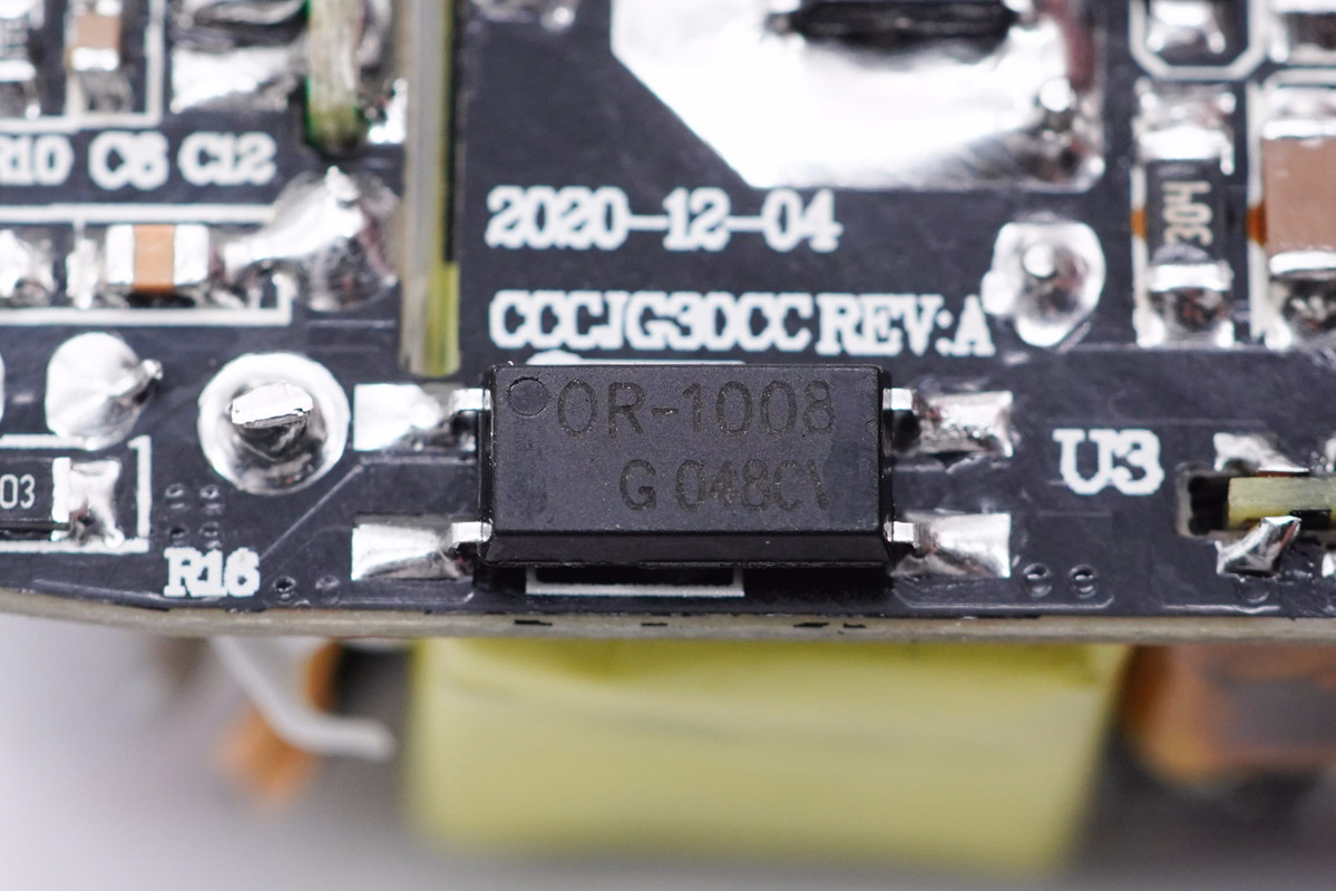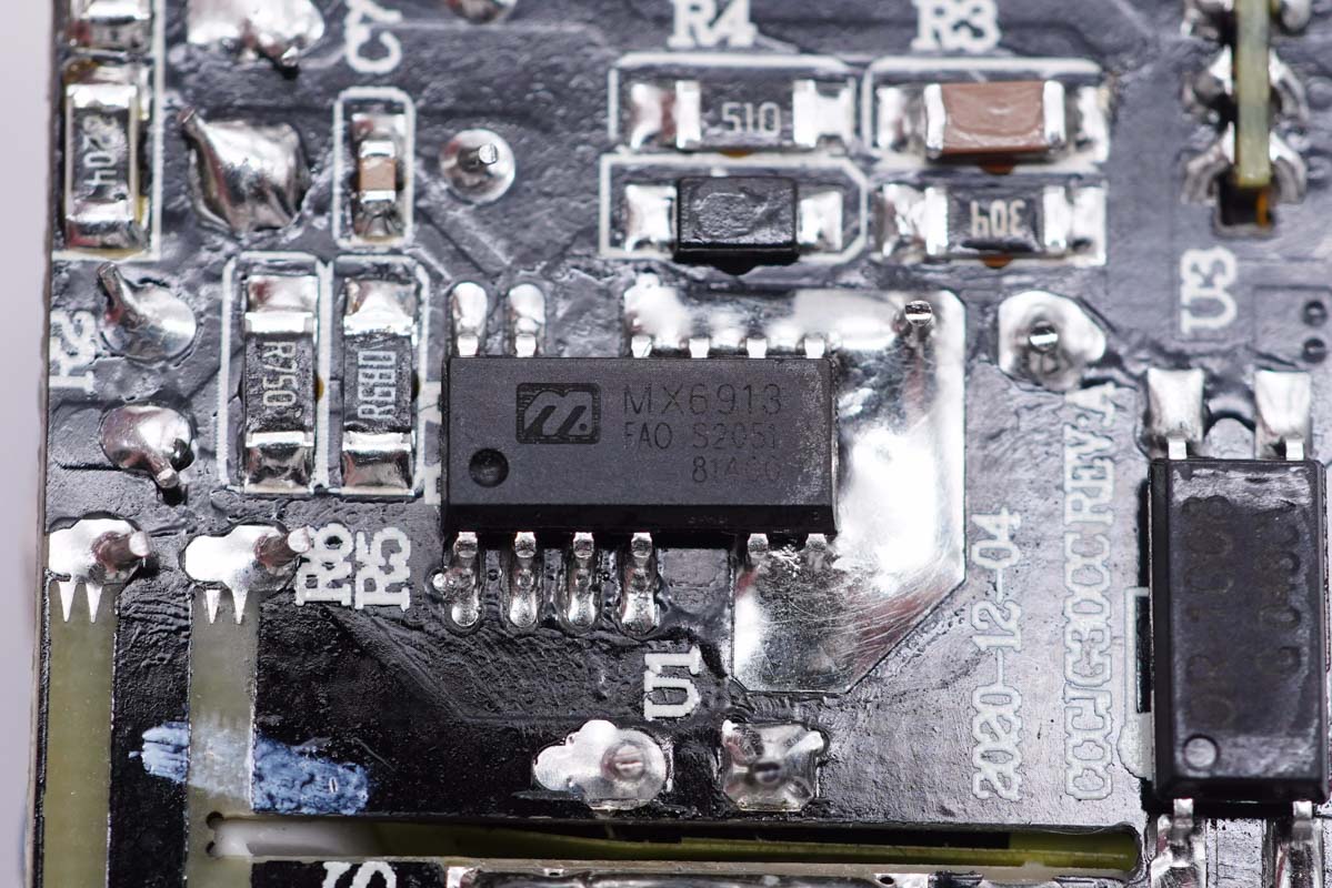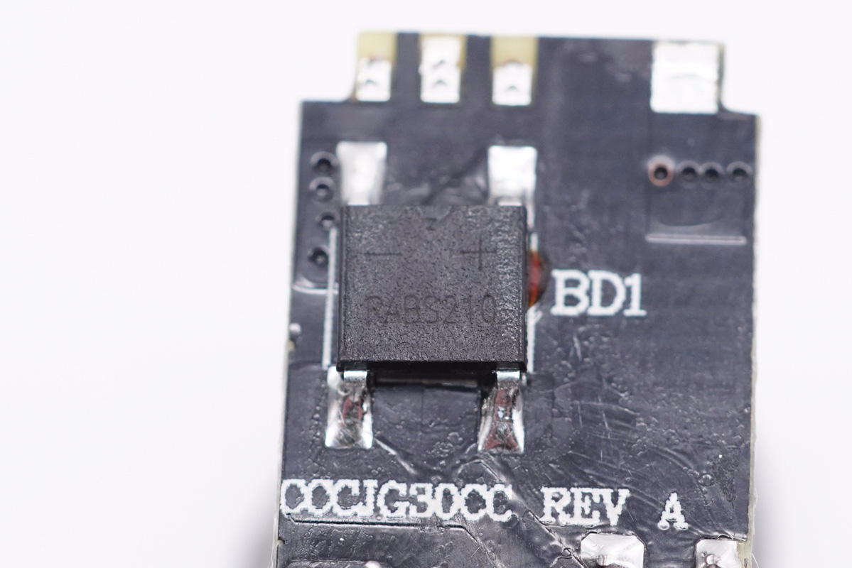主PCB焊錫面,可以看到如此迷你的PCB上,元器件非常的簡潔,在板子背面僅看到初級的高集成度主控芯片和連接初次級的光耦。