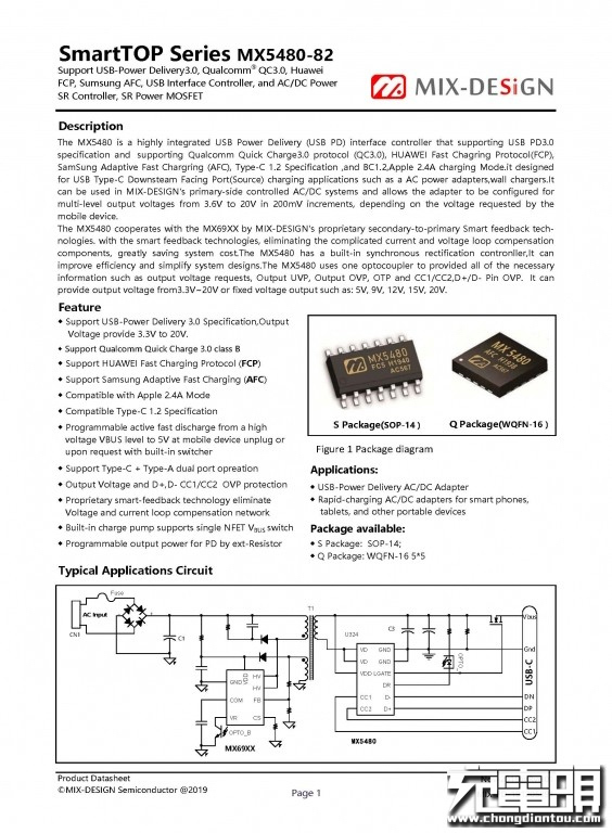 美思迪賽半導(dǎo)體MX5480是業(yè)界首顆集成同步整流控制器、同步整流MOS管、多協(xié)議處理三大功能的次級芯片。MX5480支持USB PD快充A+C解決方案,支持QC、PD和其它多個私有快充協(xié)議。該芯片僅僅14個Pin腳確將次級協(xié)議和同步整流一切必要的功能All in one,用外部最少的Pin腳完成極復(fù)雜的功能。