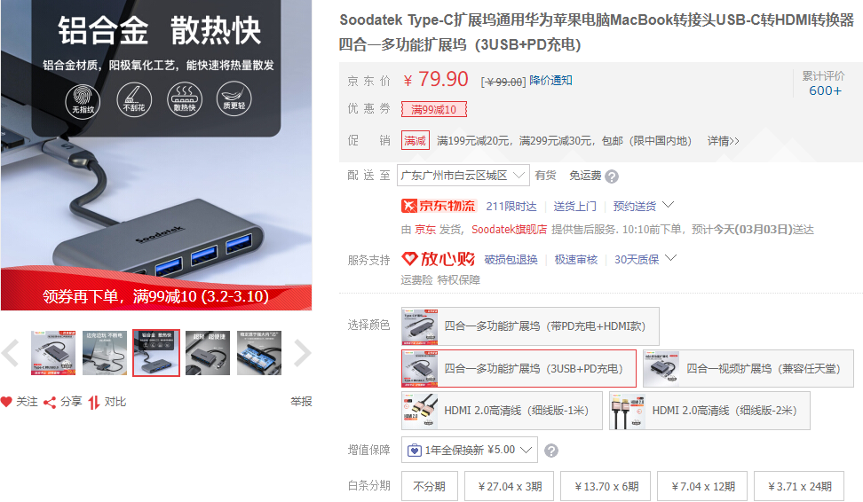小編想買MacBook M1,就是接口有點少,Soodatek這款四合一多功能擴展塢不錯,3A1C四個接口,充電+傳輸數據,基本滿足需求。