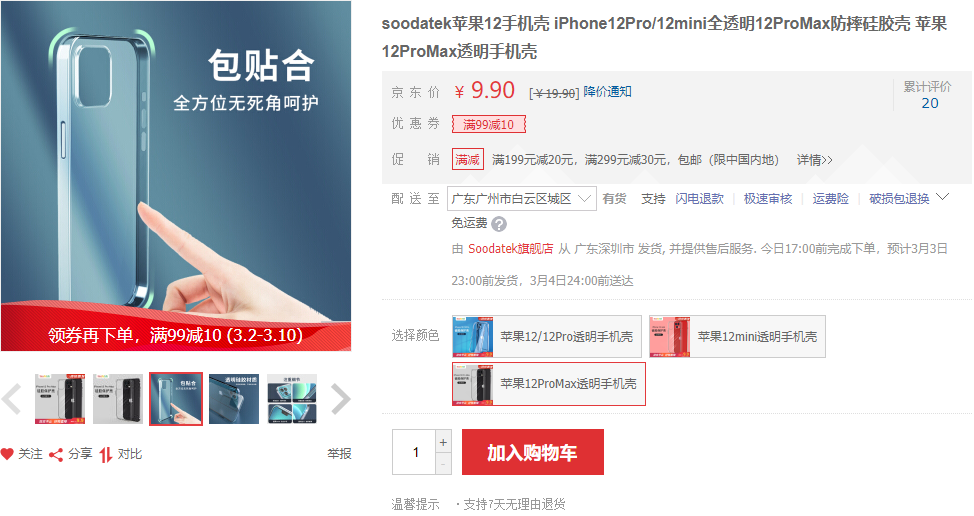 蘋果手機殼膜系列更加精簡,只有一個清水殼和高清鋼化膜。這個iPhone 12手機殼簡簡單單,全透明沒有花里胡哨的東西,僅售9.9元。小編認為采購Soodatek其他產品時順便買個殼膜還是不錯的,起個湊單作用。