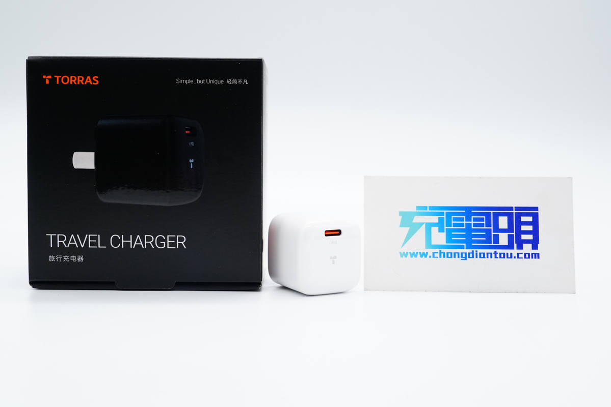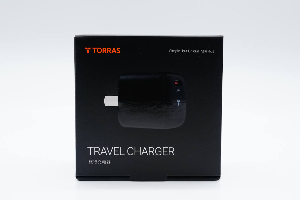 包裝盒方形黑色,頂部印有TORRAS品牌、充電器外觀圖以及名稱。
