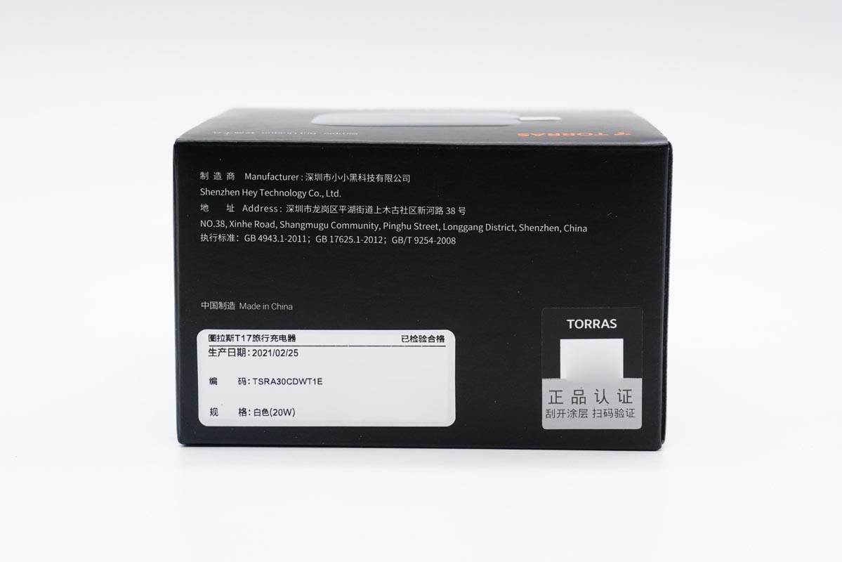 側(cè)面印有制造商信息,此外貼有充電器信息貼紙和防偽碼。