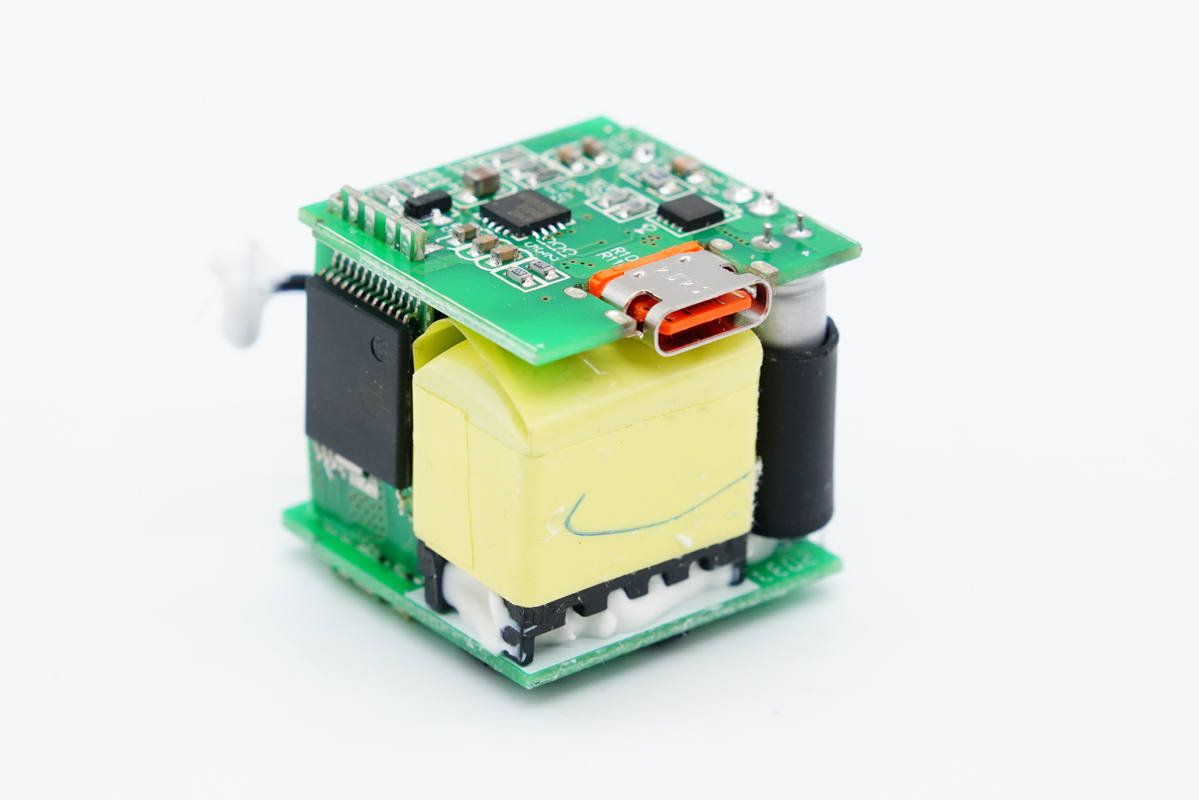 充電器采用3塊小板組合焊接設(shè)計(jì),U型結(jié)構(gòu),是時(shí)下迷你充主要設(shè)計(jì)方法,可以最大化利用內(nèi)部空間。另外還采用了經(jīng)典的開關(guān)電源寬范圍輸出,協(xié)議芯片通過光耦反饋控制輸出電壓架構(gòu),下面來詳細(xì)了解各元器件的信息。