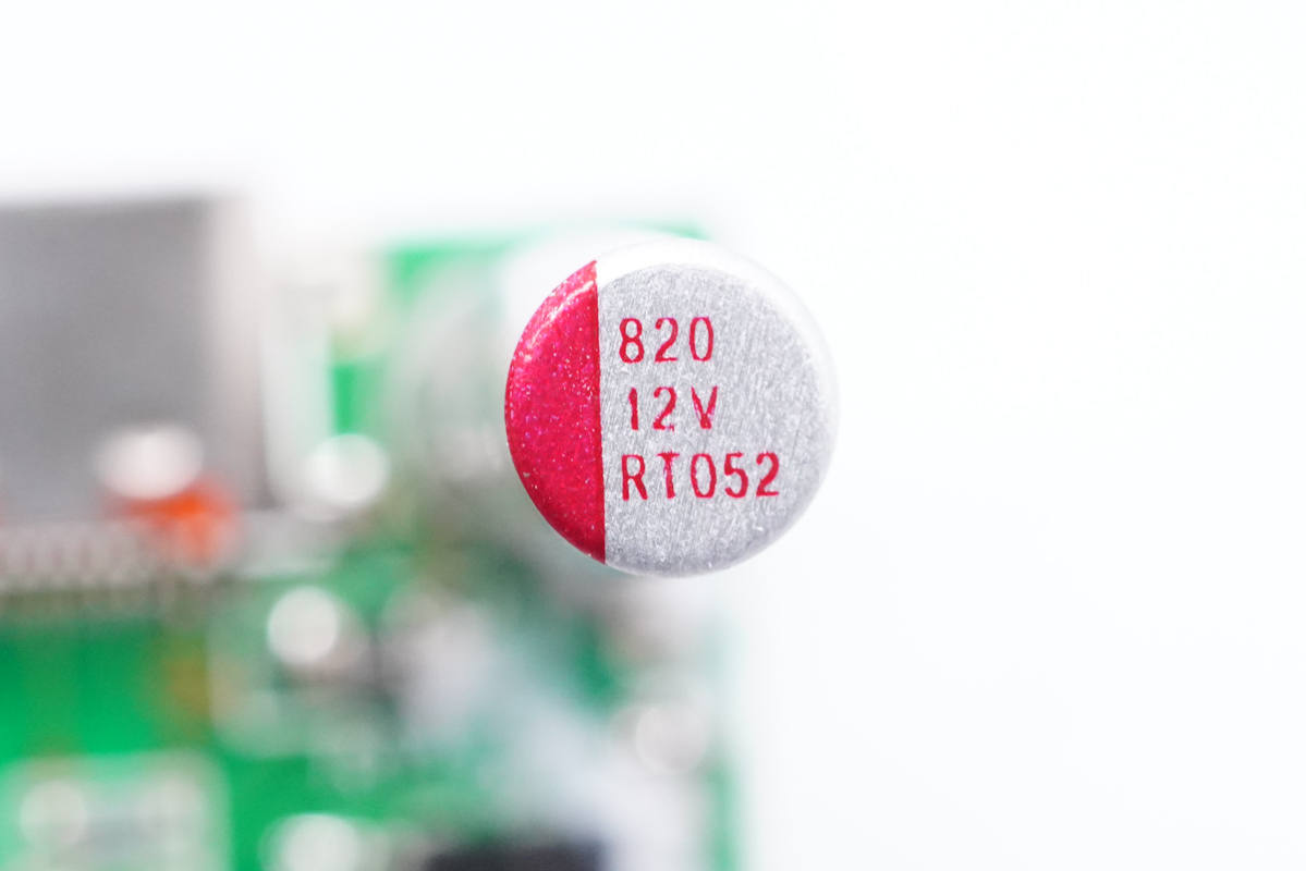 輸出濾波固態(tài)電容特寫,規(guī)格為12V 820μF。
