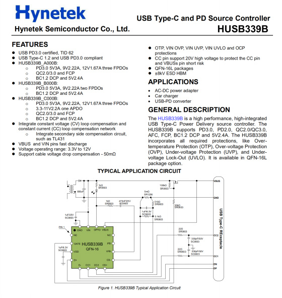 USB PD快充協(xié)議芯片來自慧能泰半導(dǎo)體,型號(hào)HUSB339B,該芯片已獲得USB-IF協(xié)會(huì)PD3.0認(rèn)證(TID:62),此外還可兼容PD2.0、QC2.0、QC3.0、AFC、FCP、BC1.2、Apple2.4A等多種充電協(xié)議,適用于20W PD旅充和車充等應(yīng)用場合。