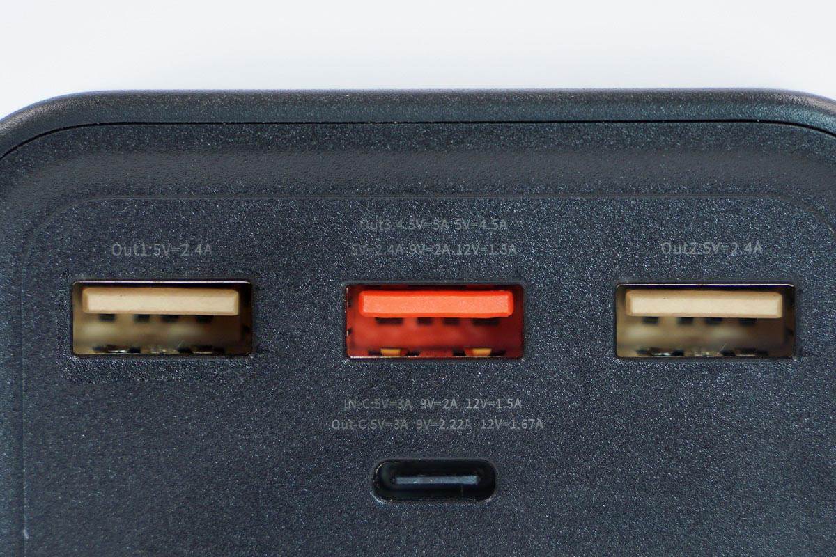 USB接口特寫:USB-C口黑色膠芯不露銅,支持雙向快充;中間USB-A口橘紅色膠芯,支持快充輸出;兩側白色膠芯的為標充口。