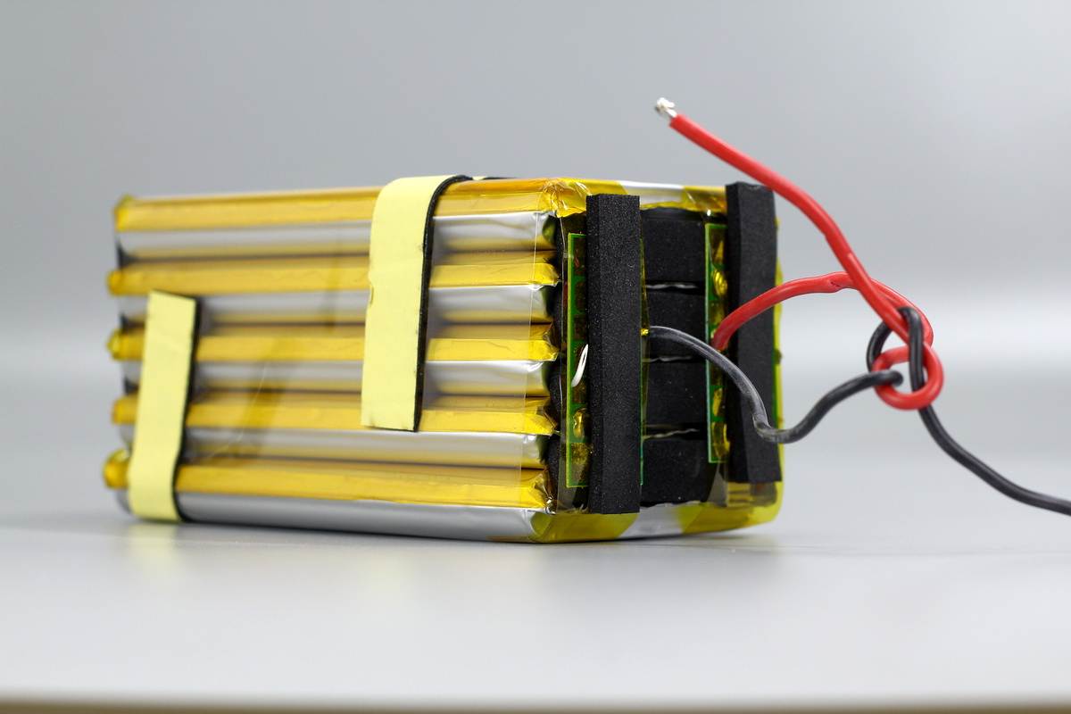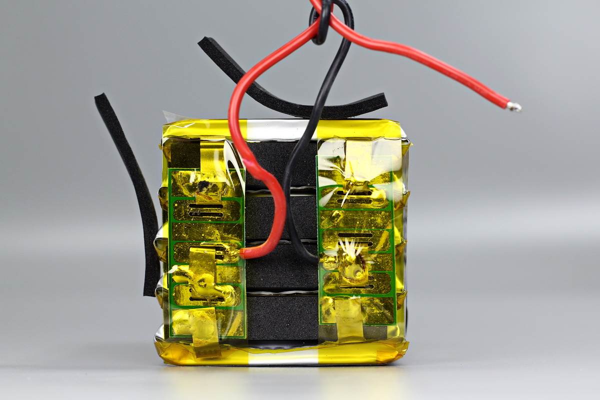 電芯極耳間填充泡棉,兩側采用PCB板將正/負極鎳片連接,五塊電芯并聯。